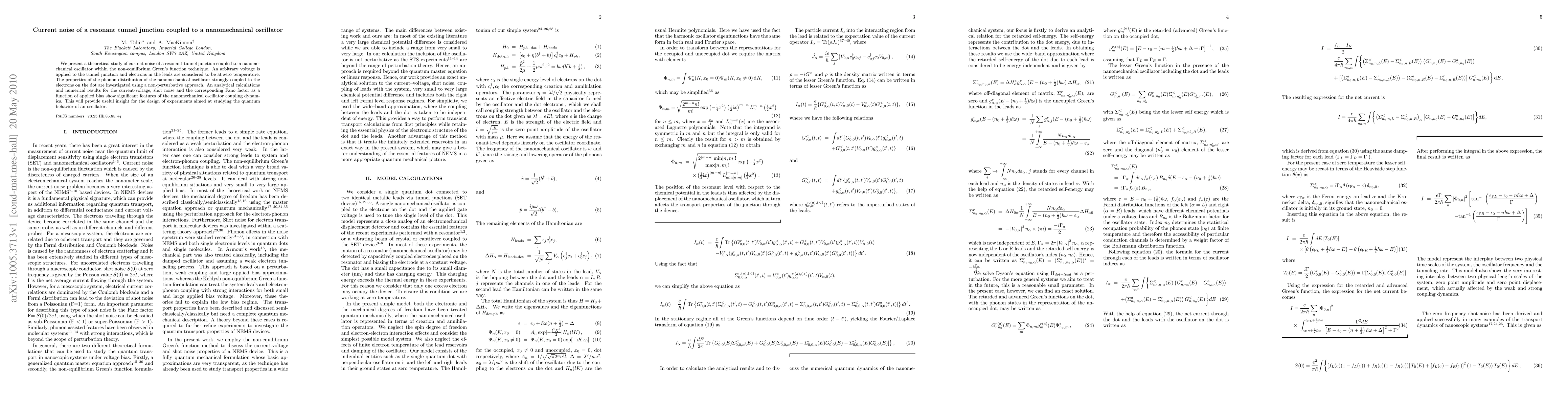 This paper theoretically investigates the current noise in a resonant tunnel junction coupled to a nanomechanical oscillator using non-equilibrium Green's functions. Analytical and numerical results reveal significant features of the coupling dynamics between the oscillator and electrons, providing insights for quantum behavior studies.
