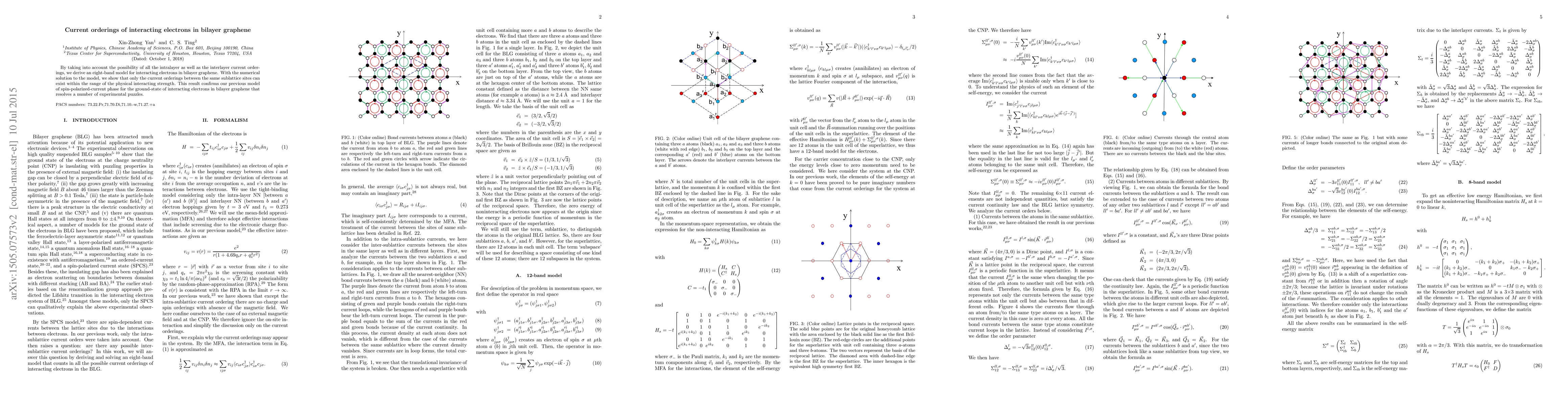 This paper develops an eight-band model for interacting electrons in bilayer graphene, revealing that only current orderings between the same sublattice sites can exist within the physical interacting strength range, confirming a previous model of spin-polarized-current phase and resolving experimental puzzles.