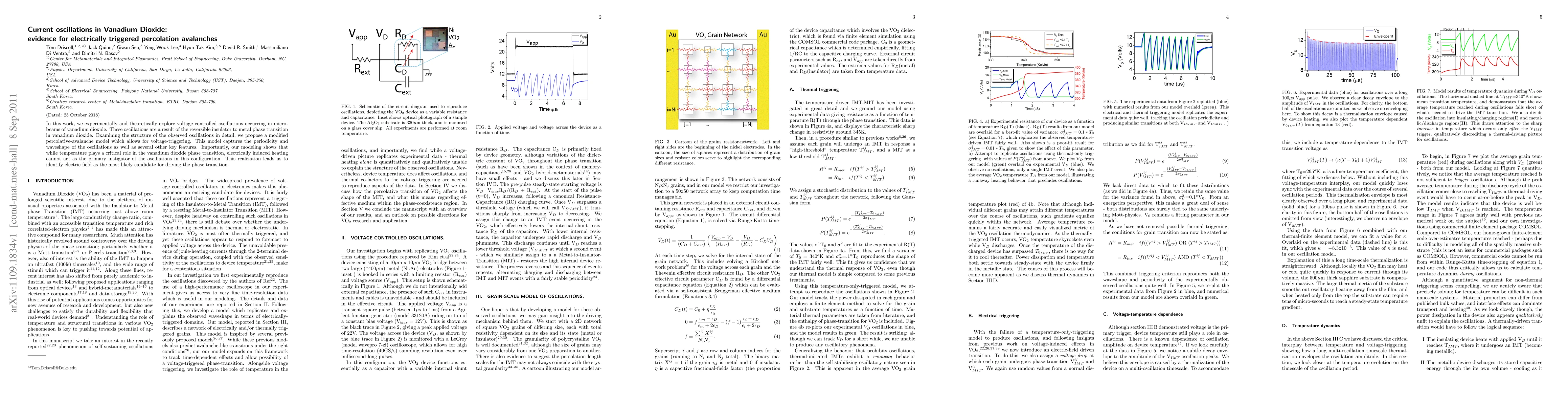 This paper investigates voltage-controlled oscillations in vanadium dioxide micro-beams, attributing them to the material's insulator-to-metal phase transition. The study proposes a modified percolation avalanche model to explain the observed oscillations, highlighting that electric fields rather than temperature-induced heating are the primary drivers.