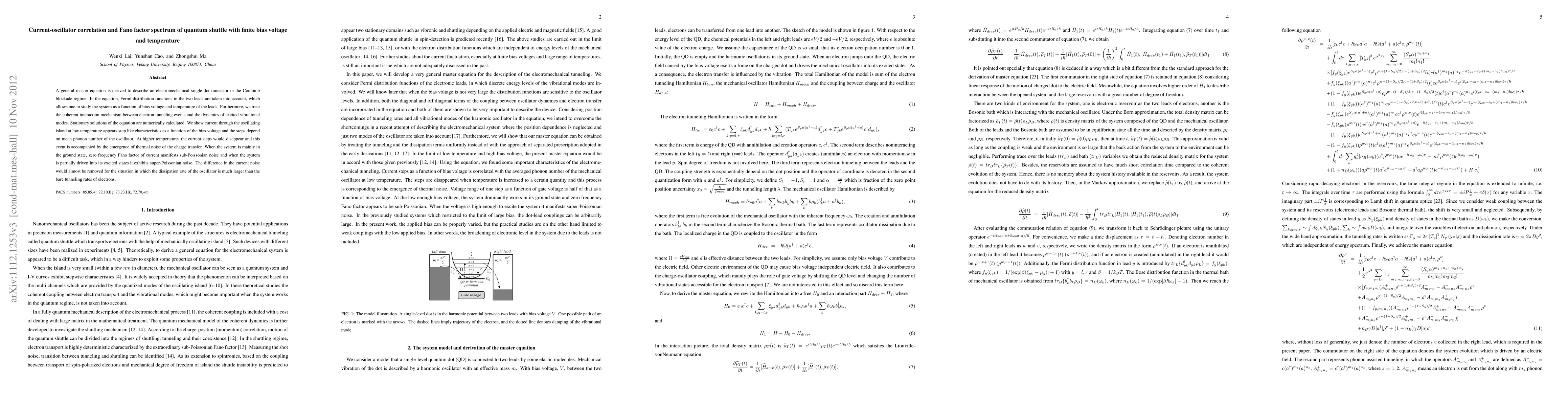 A general master equation is derived to describe an electromechanical single-dot transistor in the Coulomb blockade regime. In the equation, Fermi distribution functions in the two leads are taken into account, which allows one to study the system as a function of bias voltage and temperature of the leads. Furthermore, we treat the coherent interaction mechanism between electron tunneling events and the dynamics of excited vibrational modes. Stationary solutions of the equation are numerically calculated. We show current through the oscillating island at low temperature appears step like characteristics as a function of the bias voltage and the steps depend on mean phonon number of the oscillator. At higher temperatures the current steps would disappear and this event is accompanied by the emergence of thermal noise of the charge transfer. When the system is mainly in the ground state, zero frequency Fano factor of current manifests sub-Poissonian noise and when the system is partially driven into its excited states it exhibits super-Poissonian noise. The difference in the current noise would almost be removed for the situation in which the dissipation rate of the oscillator is much larger than the bare tunneling rates of electrons.