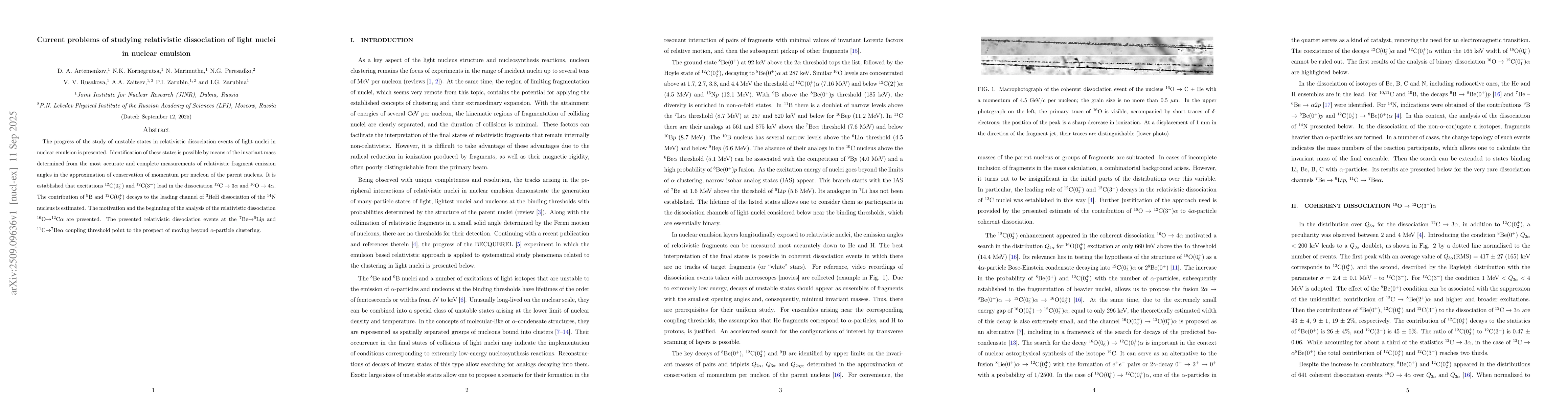The progress of the study of unstable states in relativistic dissociation events of light nuclei in nuclear emulsion is presented. Identification of these states is possible by means of the invariant mass determined from the most accurate and complete measurements of relativistic fragment emission angles in the approximation of conservation of momentum per nucleon of the parent nucleus. It is established that excitations $^{12}\mathrm{C}(0^{+}_{2})$ and $^{12}\mathrm{C}(3^{-})$ lead in the dissociation $^{12}\mathrm{C} \rightarrow 3\alpha$ and $^{16}\mathrm{O} \rightarrow 4\alpha$. The contribution of $^{9}\mathrm{B}$ and $^{12}\mathrm{C}(0^{+}_{2})$ decays to the leading channel of $^{3}\mathrm{HeH}$ dissociation of the $^{14}\mathrm{N}$ nucleus is estimated. The motivation and the beginning of the analysis of the relativistic dissociation $^{16}\mathrm{O}$$\rightarrow$$^{12}\mathrm{C}\alpha$ are presented. The presented relativistic dissociation events at the $^{7}\mathrm{Be}$$\rightarrow$$^{6}\mathrm{Li}p$ and $^{11}\mathrm{C}$$\rightarrow$$ ^{7}\mathrm{Be}\alpha$ coupling threshold point to the prospect of moving beyond $\alpha$-particle clustering.