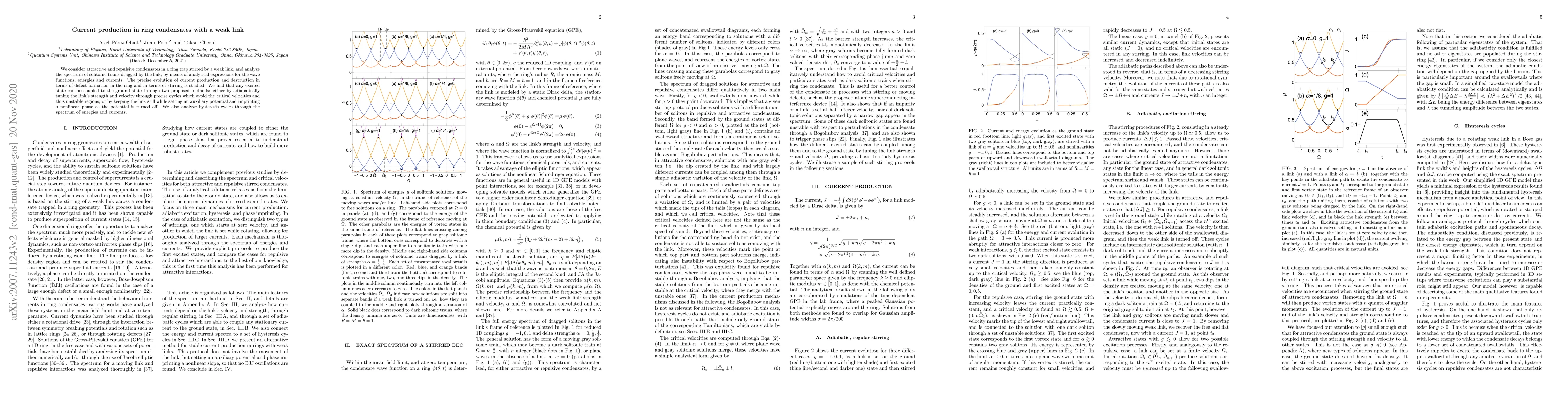We consider attractive and repulsive condensates in a ring trap stirred by a weak link, and analyze the spectrum of solitonic trains dragged by the link, by means of analytical expressions for the wave functions, energies and currents. The precise evolution of current production and destruction in terms of defect formation in the ring and in terms of stirring is studied. We find that any excited state can be coupled to the ground state through two proposed methods: either by adiabatically tuning the link's strength and velocity through precise cycles which avoid the critical velocities and thus unstable regions, or by keeping the link still while setting an auxiliary potential and imprinting a nonlinear phase as the potential is turned off. We also analyze hysteresis cycles through the spectrum of energies and currents.