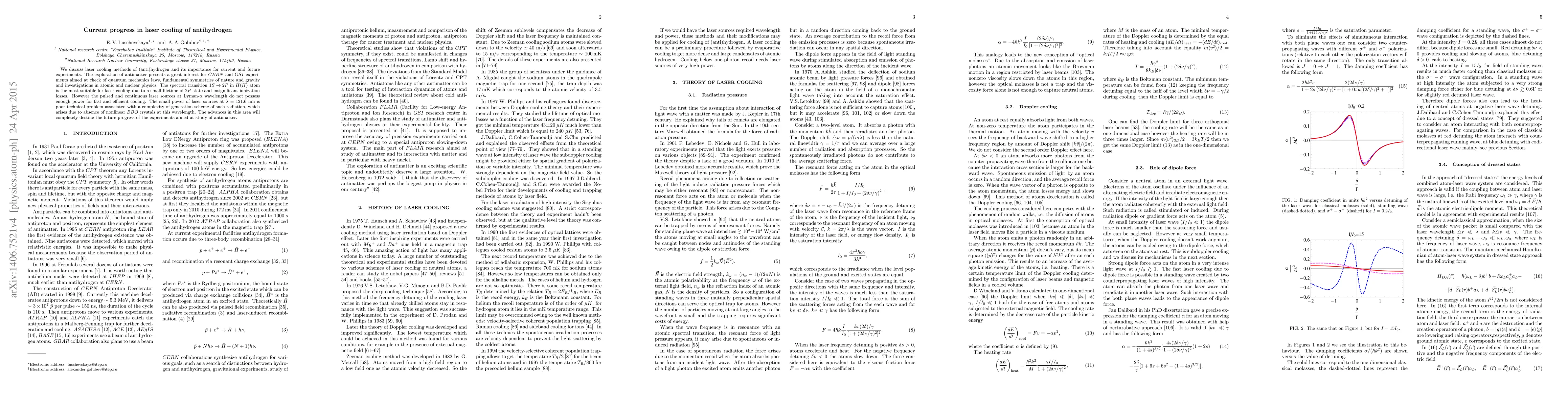 We discuss laser cooling methods of (anti)hydrogen and its importance for current and future experiments. The exploration of antimatter presents a great interest for $CERN$ and $GSI$ experiments aimed at check of quantum mechanics laws, fundamental symmetries of nature and gravity and investigations in atomic and nuclear physics. The spectral transition $1S\rightarrow 2P$ in $\bar{H} (H)$ atom is the most suitable for laser cooling due to a small lifetime of $2P$ state and insignificant ionization losses. However the pulsed and continuous laser sources at Lyman-$\alpha$ wavelength do not possess enough power for fast and efficient cooling. The small power of laser sources at $\lambda=121.6\ \nm$ is poor technical problem associated with a complexity of generation scheme of such radiation, which arises due to absence of nonlinear $BBO$ crystals at this wavelength. The advances in this area will completely destine the future progress of the experiments aimed at study of antimatter.