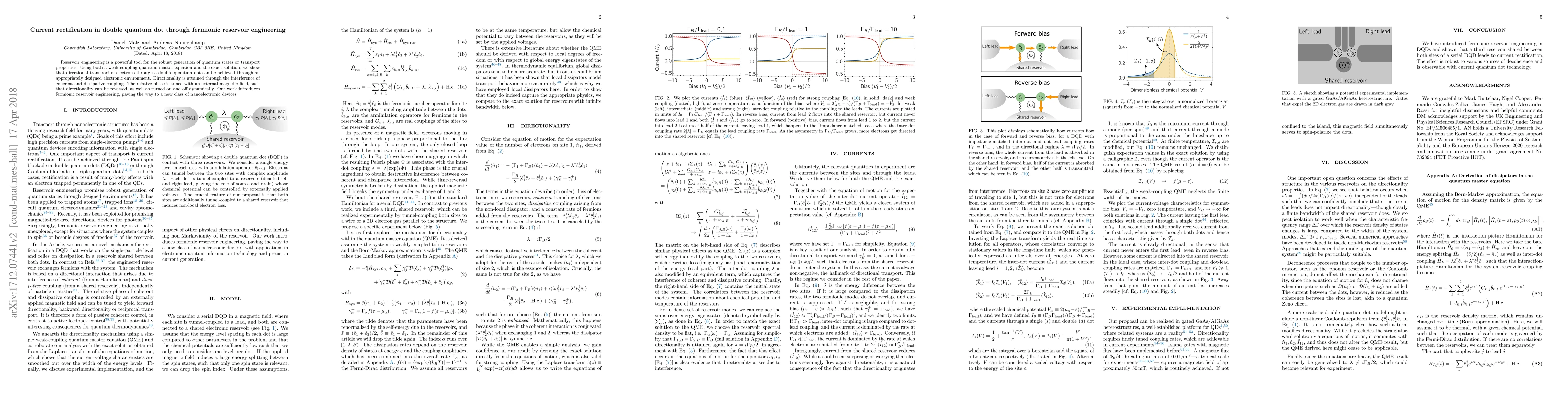 This paper demonstrates how reservoir engineering can achieve current rectification in a double quantum dot via interference of coherent and dissipative coupling, with directionality controlled by an external magnetic field. This introduces a new method of fermionic reservoir engineering for potential use in advanced nanoelectronic devices.
