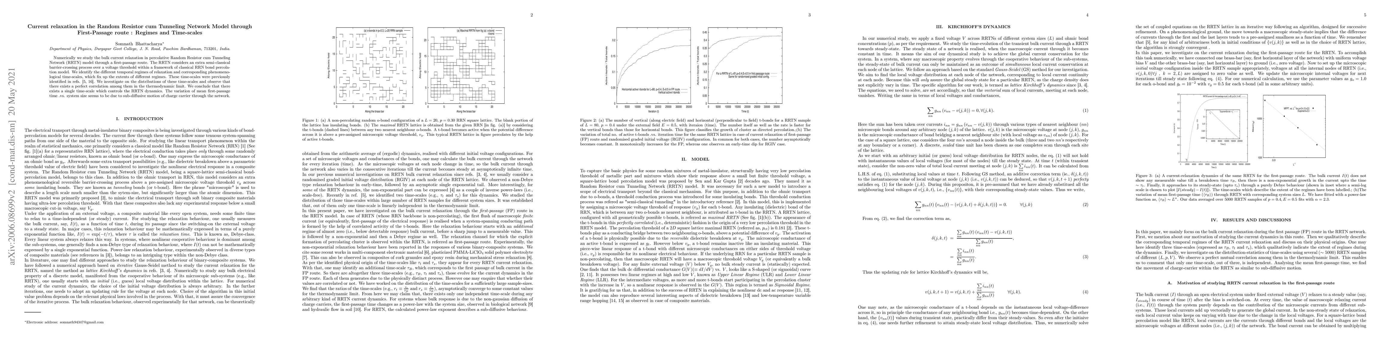 Numerically we study the bulk current relaxation in percolative Random Resistor cum Tunneling Network (RRTN) model through a first-passage route. The RRTN considers an extra semi-classical barrier-crossing process over a voltage threshold within a framework of classical RRN bond percolation model. We identify the different temporal regimes of relaxation and corresponding phenomenological time-scales, which fix up the extents of different regimes. These time-scales were previously identified in refs. \cite{relax-physicaA, aksubh}. We investigate on the distributions of these time-scales and observe that there exists a perfect correlation among them in the thermodynamic limit. We conclude that there exists a single time-scale which controls the RRTN dynamics. The variation of mean first-passage time .vs. system size seems to be due to sub-diffusive motion of charge carrier through the network.