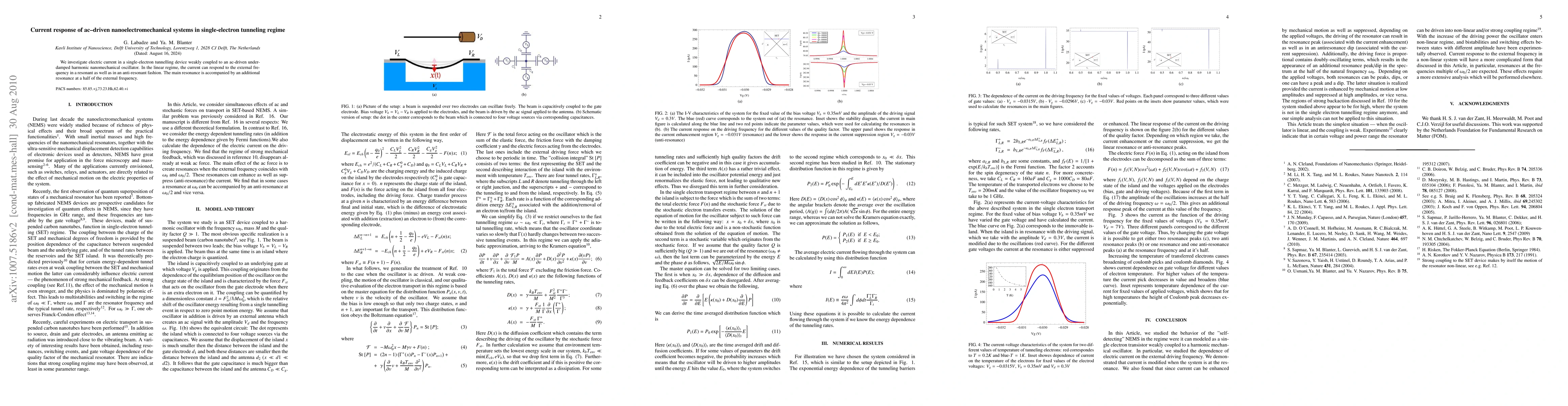 This paper examines the electric current behavior in a single-electron tunneling device connected to an ac-driven nanomechanical oscillator, revealing resonant and anti-resonant responses to the external frequency, with an additional resonance occurring at half the external frequency.