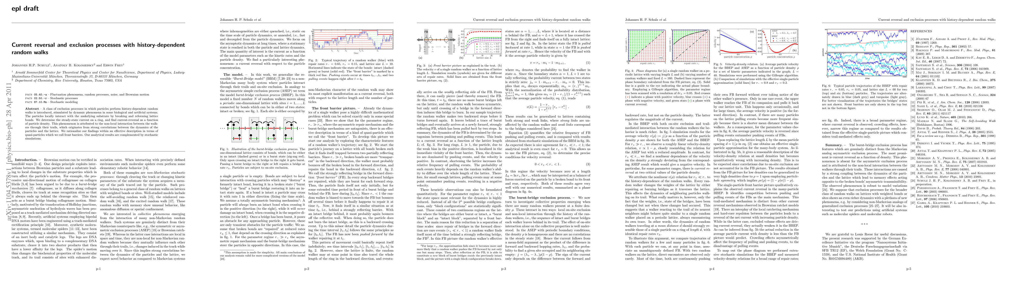 The paper presents an effective description of history-dependent random walkers using front barriers, which explains the current reversal phenomenon in exclusion processes.
