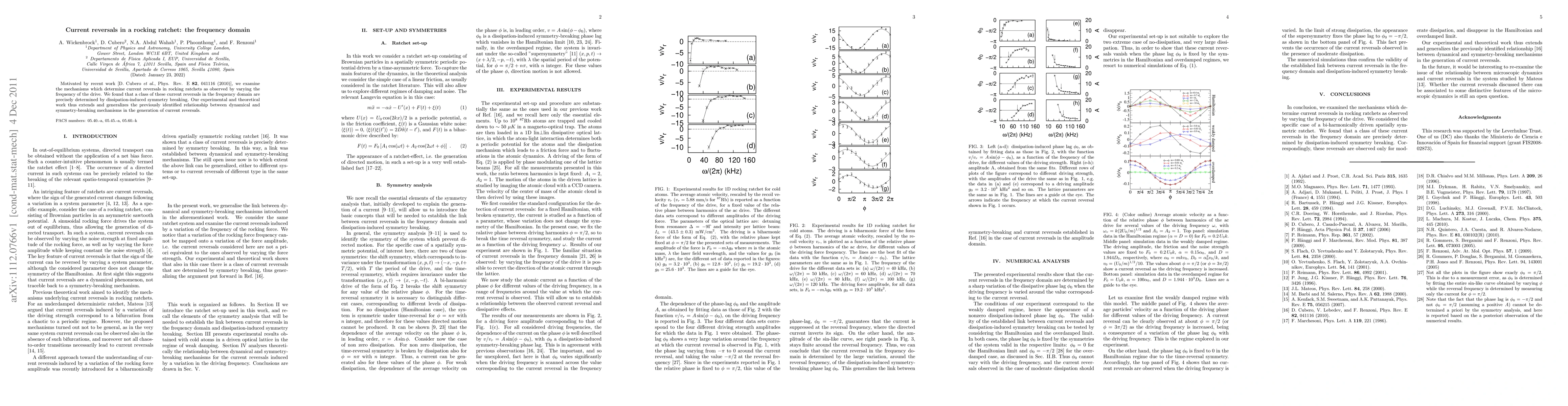Motivated by recent work [D. Cubero et al., Phys. Rev. E 82, 041116 (2010)], we examine the mechanisms which determine current reversals in rocking ratchets as observed by varying the frequency of the drive. We found that a class of these current reversals in the frequency domain are precisely determined by dissipation-induced symmetry breaking. Our experimental and theoretical work thus extends and generalizes the previously identified relationship between dynamical and symmetry-breaking mechanisms in the generation of current reversals.
