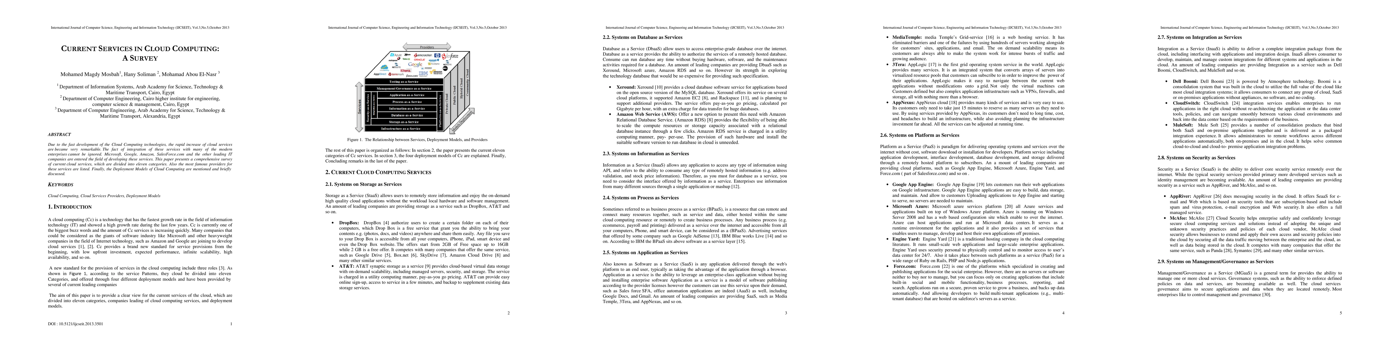 This paper provides a comprehensive survey of current cloud services, categorizing them into eleven types and listing prominent providers like Microsoft, Google, and Amazon. It also briefly discusses cloud deployment models.