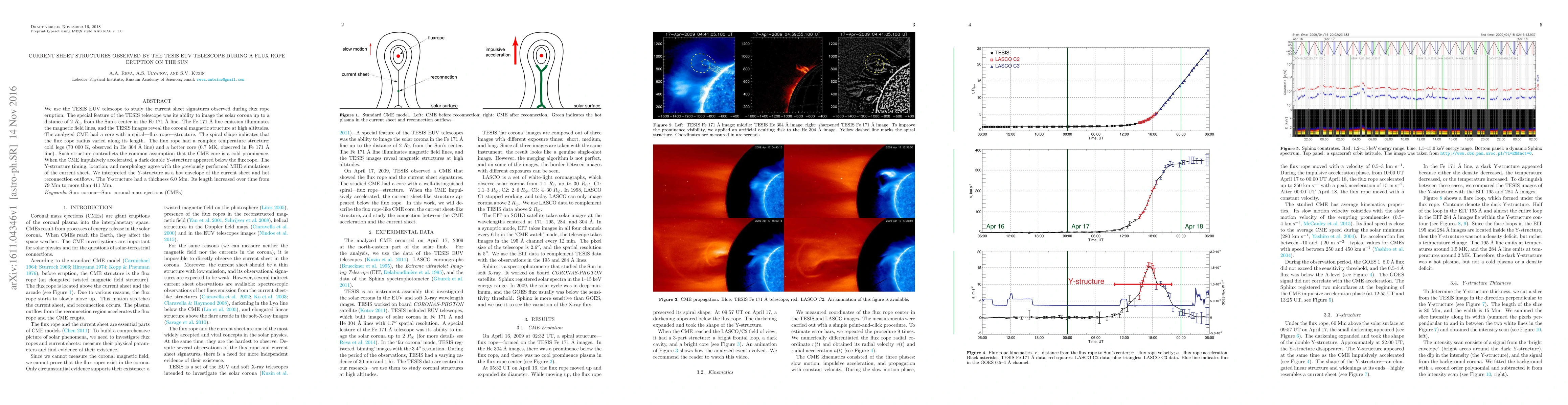 The TESIS EUV telescope observed current sheet signatures during a flux rope eruption, revealing a complex magnetic structure with a spiral-flux core and varying temperature. A dark double Y-structure emerged below the flux rope, interpreted as a current sheet's hot envelope, consistent with MHD simulations.