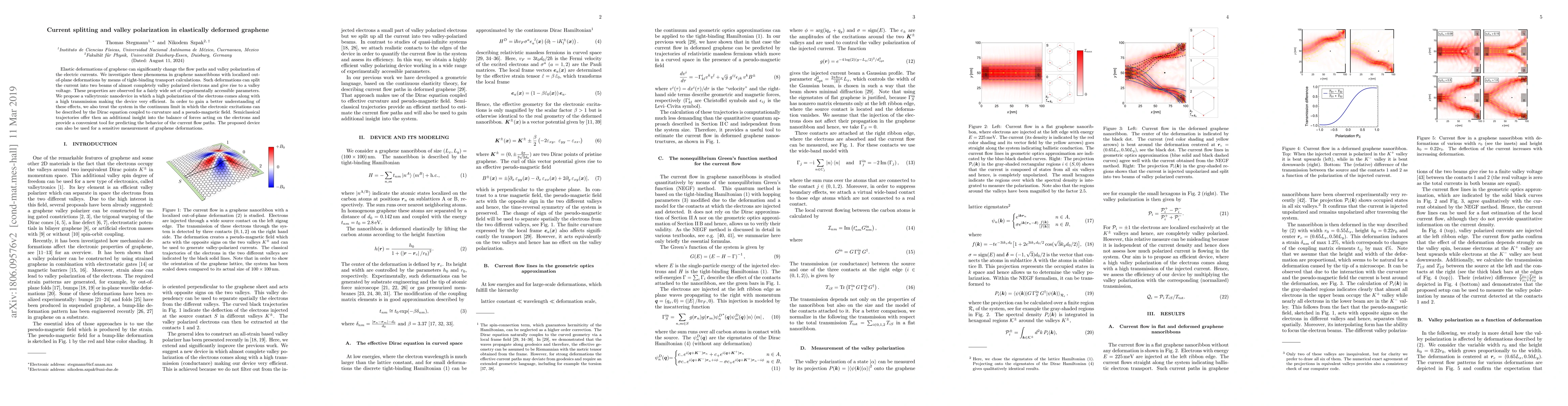 Elastic deformations of graphene can significantly change the flow paths and valley polarization of the electric currents. We investigate these phenomena in graphene nanoribbons with localized out-of-plane deformations by means of tight-binding transport calculations. Such deformations can split the current into two beams of almost completely valley polarized electrons and give rise to a valley voltage. These properties are observed for a fairly wide set of experimentally accessible parameters. We propose a valleytronic nanodevice in which a high polarization of the electrons comes along with a high transmission making the device very efficient. In order to gain a better understanding of these effects, we also treat the system in the continuum limit in which the electronic excitations can be described by the Dirac equation coupled to curvature and a pseudo-magnetic field. Semiclassical trajectories offer then an additional insight into the balance of forces acting on the electrons and provide a convenient tool for predicting the behavior of the current flow paths. The proposed device can also be used for a sensitive measurement of graphene deformations.
