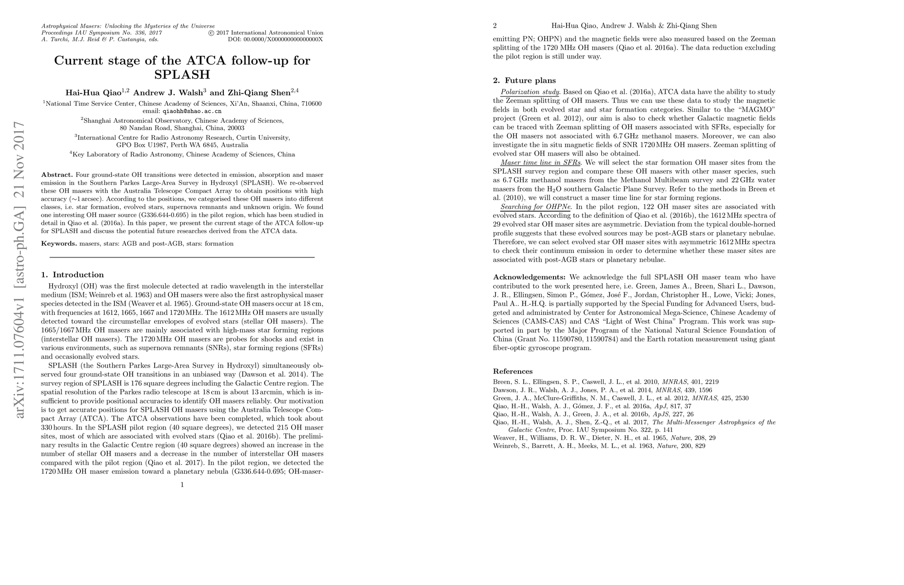 Four ground-state OH transitions were detected in emission, absorption and maser emission in the Southern Parkes Large-Area Survey in Hydroxyl (SPLASH). We re-observed these OH masers with the Australia Telescope Compact Array to obtain positions with high accuracy (~1 arcsec). According to the positions, we categorised these OH masers into different classes, i.e. star formation, evolved stars, supernova remnants and unknown origin. We found one interesting OH maser source (G336.644-0.695) in the pilot region, which has been studied in detail in Qiao et al. (2016a). In this paper, we present the current stage of the ATCA follow-up for SPLASH and discuss the potential future researches derived from the ATCA data.