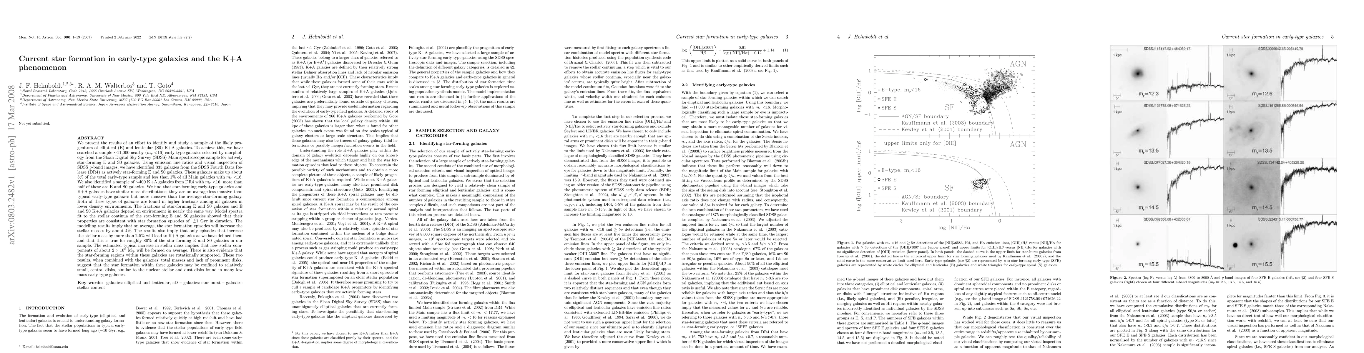 We present the results of an effort to identify and study a sample of the likely progenitors of elliptical (E) and lenticular (S0) K+A galaxies. To achieve this, we have searched a sample ~11,000 nearby (m(r)<16) early-type galaxies selected by morphology from the Sloan Digital Sky Survey (SDSS) Main spectroscopic sample for actively star-forming E and S0 galaxies. Using emission line ratios and visual inspection of SDSS g-band images, we have identified 335 galaxies from the SDSS Fourth Data Release (DR4) as actively star-forming E and S0 galaxies. These galaxies make up about 3% of the total early-type sample and less than 1% of all Main galaxies with m(r)<16. We also identified a sample of ~400 K+A galaxies from DR4 with m(r)<16; more than half of these are E and S0 galaxies. We find that star-forming early-type galaxies and K+A galaxies have similar mass distributions; they are on average less massive than typical early-type galaxies but more massive than the average star-forming galaxy. Both of these types of galaxies are found in higher fractions among all galaxies in lower density environments. The fractions of star-forming E and S0 galaxies and E and S0 K+A galaxies depend on environment in nearly the same way. Model spectra fit to the stellar continua of the star-forming E and S0 galaxies showed that their properties are consistent with star formation episodes of <1 Gyr in duration. The modelling results imply that on average, the star formation episodes will increase the stellar masses by about 4%. There is also evidence that the star-forming regions within these galaxies are rotationally supported.