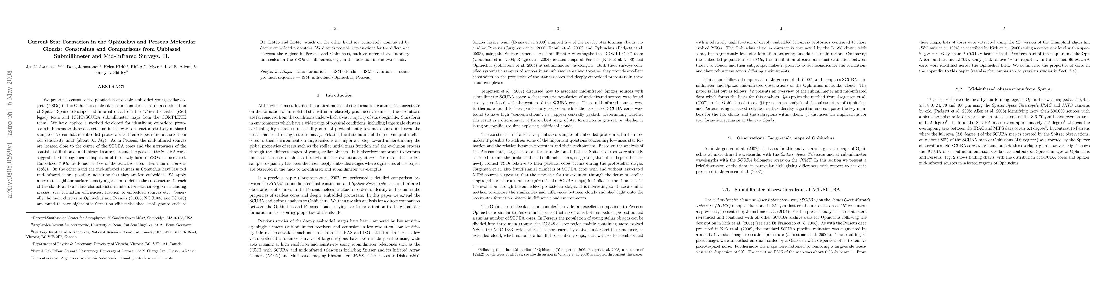 This paper presents a census of embedded young stellar objects in the Ophiuchus molecular cloud using Spitzer and JCMT data, identifying 27 candidate protostars. It compares Ophiuchus' star formation efficiency and embedded YSO population to Perseus, finding lower efficiency and less red mid-infrared colors in Ophiuchus, possibly indicating less embeddedness.