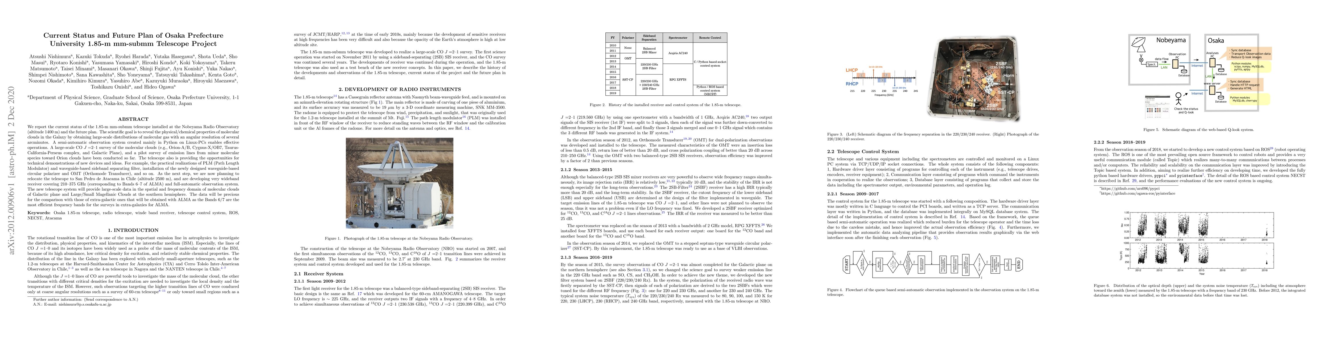 We report the current status of the 1.85-m mm-submm telescope installed at the Nobeyama Radio Observatory (altitude 1400 m) and the future plan. The scientific goal is to reveal the physical/chemical properties of molecular clouds in the Galaxy by obtaining large-scale distributions of molecular gas with an angular resolution of several arcminutes. A semi-automatic observation system created mainly in Python on Linux-PCs enables effective operations. A large-scale CO $J=$2--1 survey of the molecular clouds (e.g., Orion-A/B, Cygnus-X/OB7, Taurus-California-Perseus complex, and Galactic Plane), and a pilot survey of emission lines from minor molecular species toward Orion clouds have been conducted so far. The telescope also is providing the opportunities for technical demonstrations of new devices and ideas. For example, the practical realizations of PLM (Path Length Modulator) and waveguide-based sideband separating filter, installation of the newly designed waveguide-based circular polarizer and OMT (Orthomode Transducer), and so on. As the next step, we are now planning to relocate the telescope to San Pedro de Atacama in Chile (altitude 2500 m), and are developing very wideband receiver covering 210--375 GHz (corresponding to Bands 6--7 of ALMA) and full-automatic observation system. The new telescope system will provide large-scale data in the spatial and frequency domain of molecular clouds of Galactic plane and Large/Small Magellanic Clouds at the southern hemisphere. The data will be precious for the comparison with those of extra-galactic ones that will be obtained with ALMA as the Bands 6/7 are the most efficient frequency bands for the surveys in extra-galaxies for ALMA.