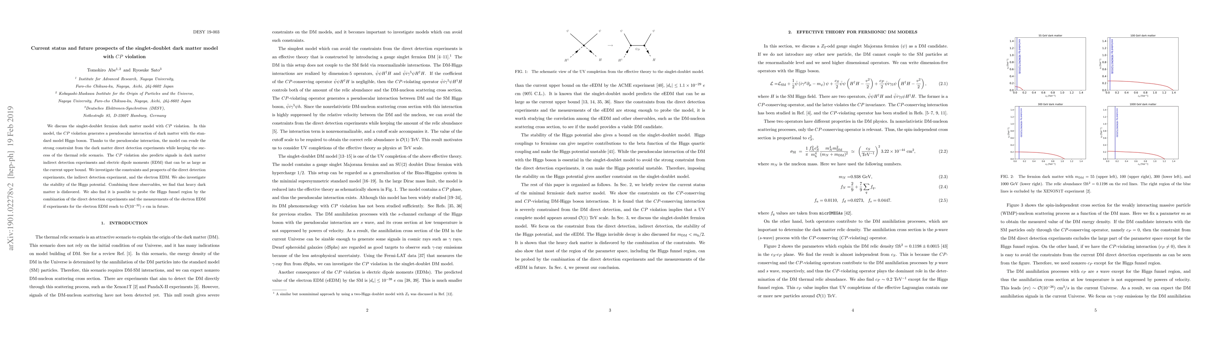 This paper explores the singlet-doublet fermion dark matter model with CP-violation, highlighting its ability to evade direct detection constraints while maintaining thermal relic success. It also predicts significant signals in indirect detection and electric dipole moments, suggesting future experimental prospects.
