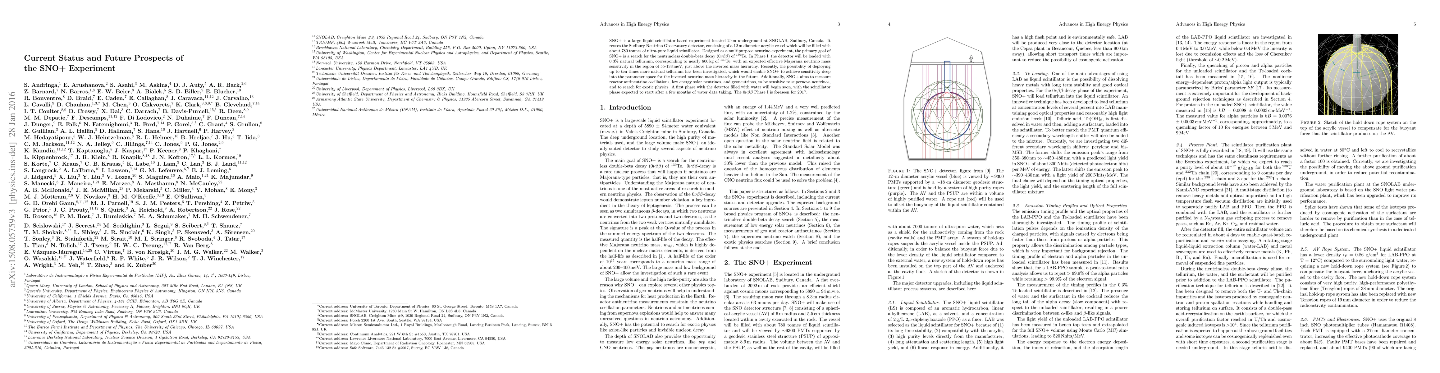 SNO+ is a large liquid scintillator-based experiment located 2km underground at SNOLAB, Sudbury, Canada. It reuses the Sudbury Neutrino Observatory detector, consisting of a 12m diameter acrylic vessel which will be filled with about 780 tonnes of ultra-pure liquid scintillator. Designed as a multipurpose neutrino experiment, the primary goal of SNO+ is a search for the neutrinoless double-beta decay (0$\nu\beta\beta$) of 130Te. In Phase I, the detector will be loaded with 0.3% natural tellurium, corresponding to nearly 800 kg of 130Te, with an expected effective Majorana neutrino mass sensitivity in the region of 55-133 meV, just above the inverted mass hierarchy. Recently, the possibility of deploying up to ten times more natural tellurium has been investigated, which would enable SNO+ to achieve sensitivity deep into the parameter space for the inverted neutrino mass hierarchy in the future. Additionally, SNO+ aims to measure reactor antineutrino oscillations, low-energy solar neutrinos, and geoneutrinos, to be sensitive to supernova neutrinos, and to search for exotic physics. A first phase with the detector filled with water will begin soon, with the scintillator phase expected to start after a few months of water data taking. The 0$\nu\beta\beta$ Phase I is foreseen for 2017.