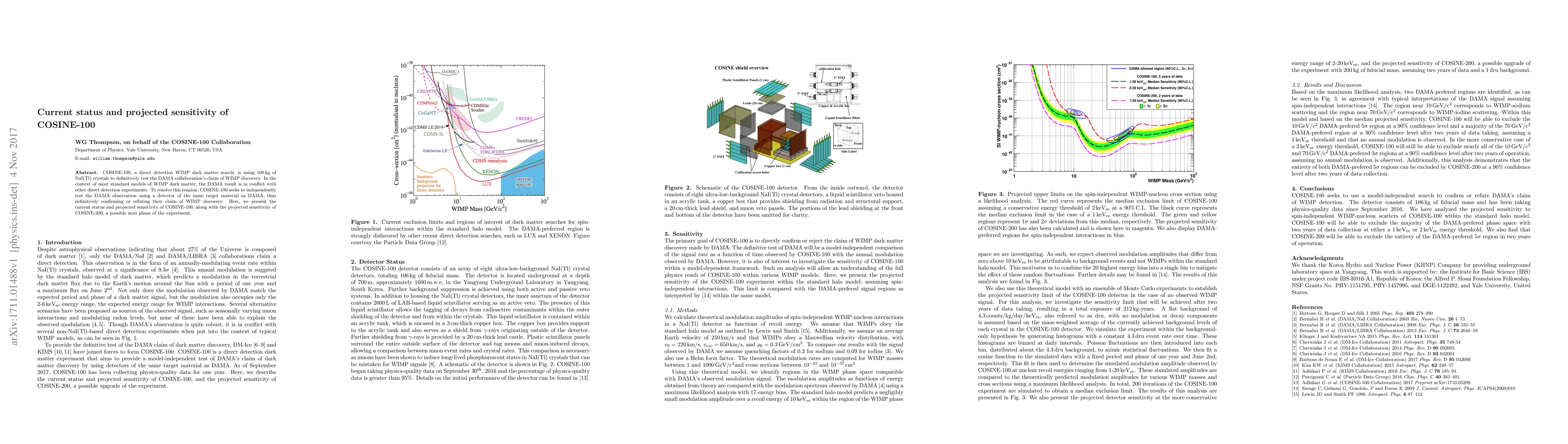 COSINE-100, a direct detection WIMP dark matter search, is using 106 kg of NaI(Tl) crystals to definitively test the DAMA collaboration's claim of WIMP discovery. In the context of most standard models of WIMP dark matter, the DAMA result is in conflict with other direct detection experiments. To resolve this tension, COSINE-100 seeks to independently test the DAMA observation using a detector of the same target material as DAMA, thus definitively confirming or refuting their claim of WIMP discovery. Here, we present the current status and projected sensitivity of COSINE-100, along with the projected sensitivity of COSINE-200, a possible next phase of the experiment.