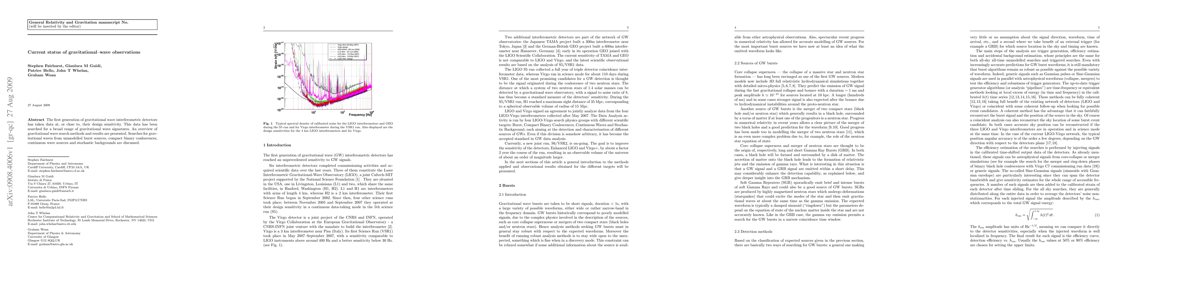 The first generation of gravitational wave interferometric detectors has taken data at, or close to, their design sensitivity. This data has been searched for a broad range of gravitational wave signatures. An overview of gravitational wave search methods and results are presented. Searches for gravitational waves from unmodelled burst sources, compact binary coalescences, continuous wave sources and stochastic backgrounds are discussed.