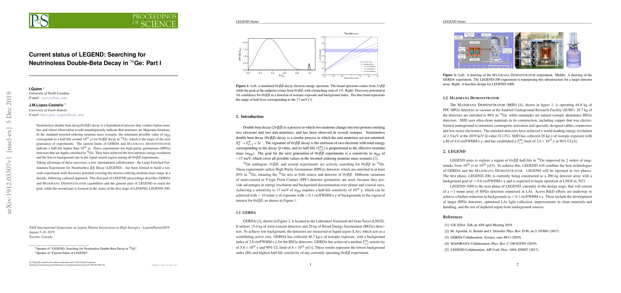 Neutrinoless double-beta decay($0\nu\beta\beta$) decay is a hypothetical process that violates lepton number, and whose observation would unambiguously indicate that neutrinos are Majorana fermions. In the standard inverted-ordering neutrino mass scenario, the minimum possible value of m$_{\beta\beta}$ corresponds to a half-life around 10$^{28}$ yr for $0\nu\beta\beta$ decay in $^{76}$Ge, which is the target of the next generation of experiments. The current limits of GERDA and \textsc{Majorana Demonstrator} indicate a half-life higher than 10$^{26}$ yr. These experiments use high-purity germanium (HPGe) detectors that are highly-enriched in $^{76}$Ge. They have achieved the best intrinsic energy resolution and the lowest background rate in the signal search region among all $0\nu\beta\beta$ experiments. Taking advantage of these successes, a new international collaboration - the Large Enriched Germanium Experiment for Neutrinoless $\beta\beta$ Decay (LEGEND) - has been formed to build a ton-scale experiment with discovery potential covering the inverse-ordering neutrino mass range in a decade, following a phased approach. This first part of LEGEND proceedings describes GERDA and \textsc{Majorana Demonstrator} capabilities and the general plan of LEGEND to reach the goal, while the second part is focused in the status of the first stage of LEGEND, LEGEND-200.