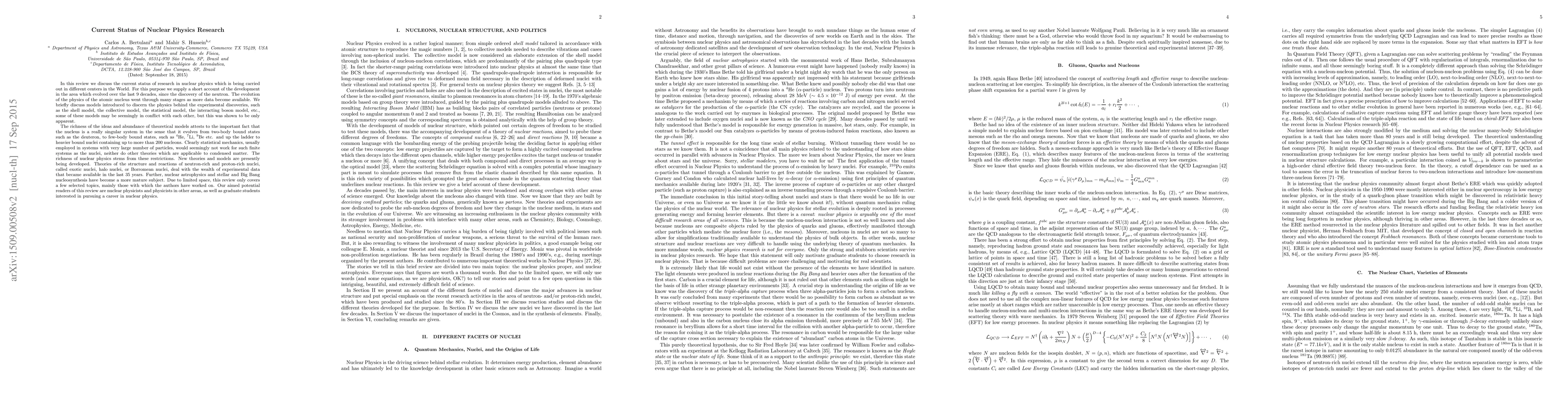 In this review we discuss the current status of research in nuclear physics which is being carried out in different centers in the World. For this purpose we supply a short account of the development in the area which evolved over the last 9 decades, since the discovery of the neutron. The evolution of the physics of the atomic nucleus went through many stages as more data become available. We briefly discuss models introduced to discern the physics behind the experimental discoveries, such as the shell model, the collective model, the statistical model, the interacting boson model, etc., some of these models may be seemingly in conflict with each other, but this was shown to be only apparent. The richness of the ideas and abundance of theoretical models attests to the important fact that the nucleus is a really singular system in the sense that it evolves from two-body bound states such as the deuteron, to few-body bound states, such as $^4$He, $^7$Li, $^9$Be etc. and up the ladder to heavier bound nuclei containing up to more than 200 nucleons. Clearly statistical mechanics does not work for such finite system, neither does other theories applicable to condensed matter systems. The richness of nuclear physics stems from these restrictions. New theories and models are presently being developed. Theories of the structure and reactions of neutron-rich and proton-rich nuclei, called exotic nuclei, halo nuclei, or Borromean nuclei deal with the wealth of experimental data available in the last 35 years. Further, nuclear astrophysics and stellar and Big Bang nucleosynthesis have become a more mature subject. Due to limited space, this review only covers a few selected topics, mainly those with which the authors have worked with.