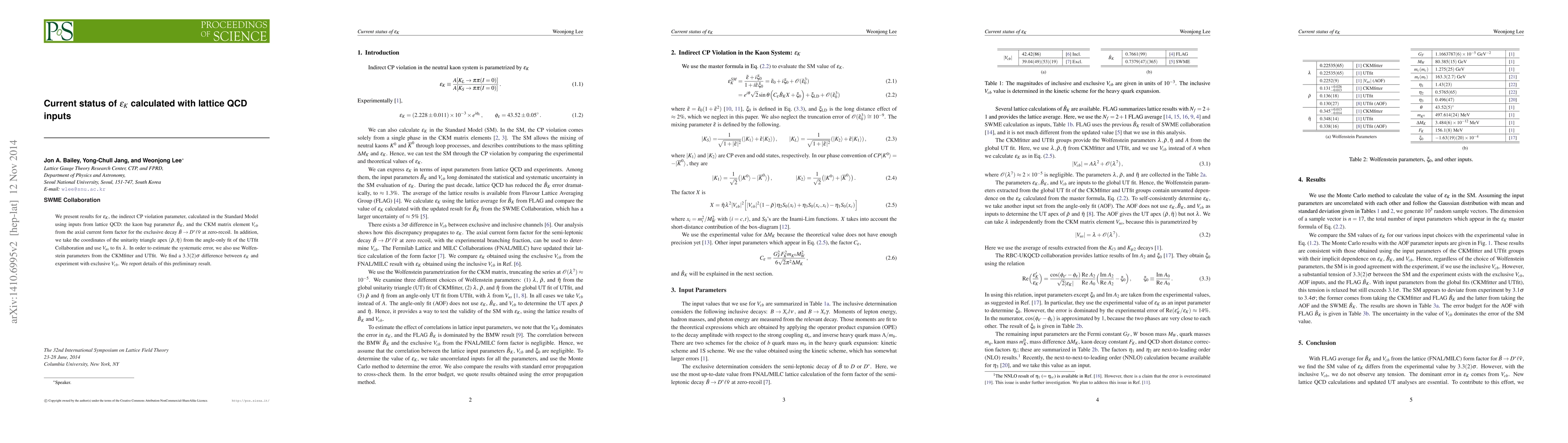 This paper presents a calculation of the indirect CP violation parameter $\varepsilon_K$ using lattice QCD inputs, including the kaon bag parameter $\hat{B}_K$ and the CKM matrix element $V_{cb}$. The study finds a $3.3(2)\sigma$ discrepancy between theoretical results and experimental data.
