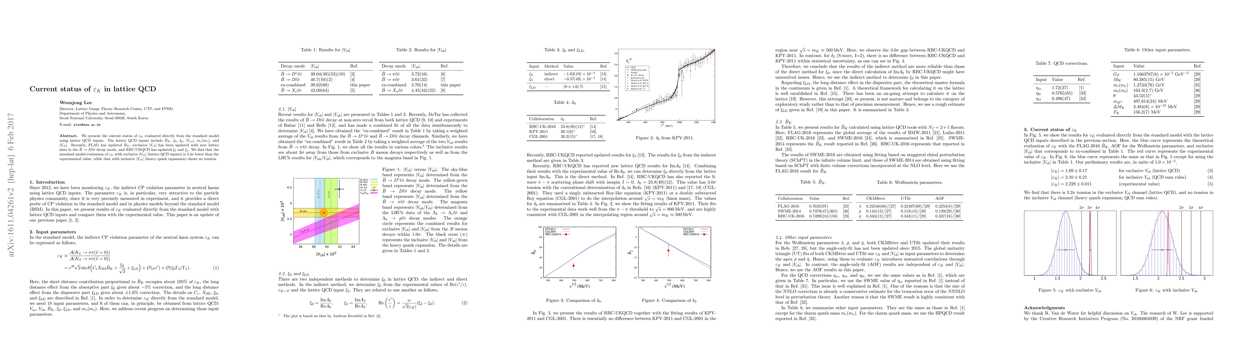 We present the current status of $\varepsilon_K$ evaluated directly from the standard model using lattice QCD inputs. The lattice QCD inputs include $\hat{B}_K$, $\xi_0$, $\xi_2$, $|V_{us}|$, $m_c(m_c)$, and $|V_{cb}|$. Recently, FLAG has updated $\hat{B}_K$, exclusive $|V_{cb}|$ has been updated with new lattice data in the $\bar{B}\to D\ell\bar{\nu}$ decay mode, and RBC-UKQCD has updated $\xi_0$ and $\xi_2$. We find that the standard model evaluation of $\varepsilon_K$ with exclusive $|V_{cb}|$ (lattice QCD inputs) is $3.2\sigma$ lower than the experimental value, while that with inclusive $|V_{cb}|$ (heavy quark expansion) shows no tension.