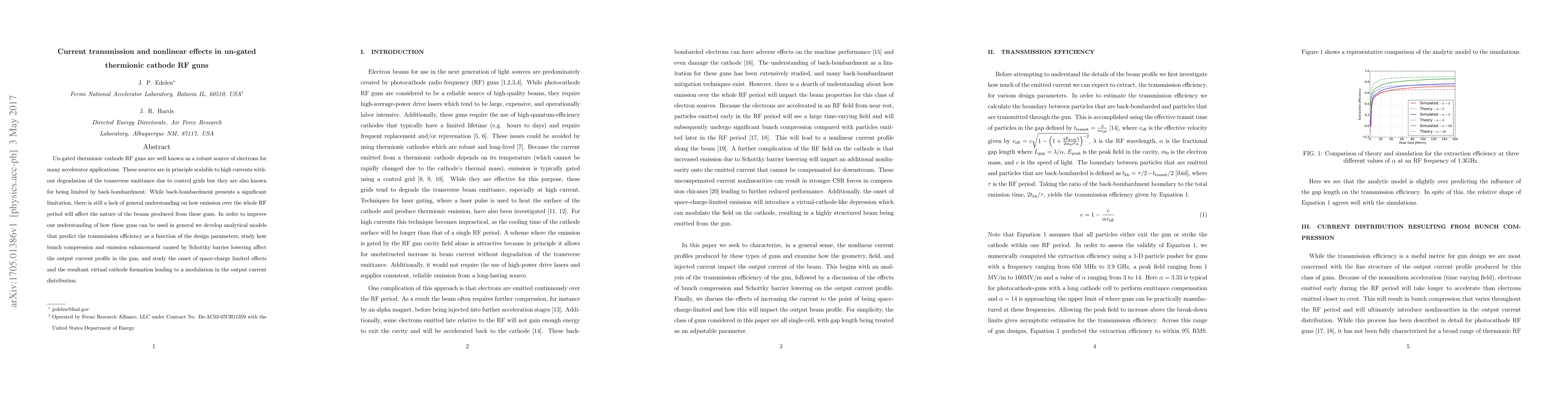 This paper develops analytical models to understand the current transmission and nonlinear effects in un-gated thermionic cathode RF guns, focusing on the impact of back-bombardment, Schottky barrier lowering, and space-charge limited effects on the electron beam's output current profile.