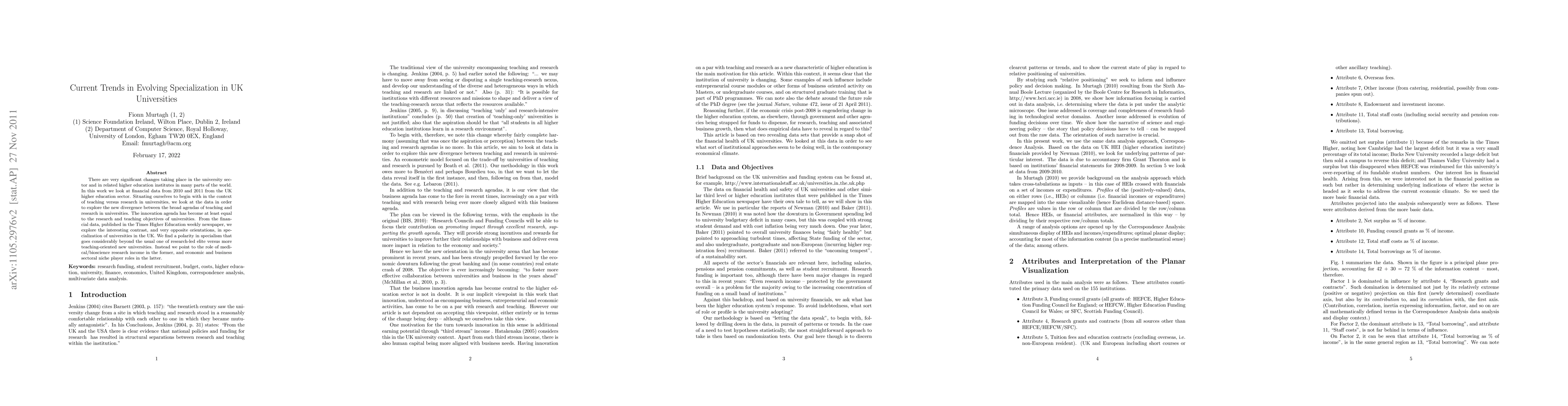 There are very significant changes taking place in the university sector and in related higher education institutes in many parts of the world. In this work we look at financial data from 2010 and 2011 from the UK higher education sector. Situating ourselves to begin with in the context of teaching versus research in universities, we look at the data in order to explore the new divergence between the broad agendas of teaching and research in universities. The innovation agenda has become at least equal to the research and teaching objectives of universities. From the financial data, published in the Times Higher Education weekly newspaper, we explore the interesting contrast, and very opposite orientations, in specialization of universities in the UK. We find a polarity in specialism that goes considerably beyond the usual one of research-led elite versus more teaching-oriented new universities. Instead we point to the role of medical/bioscience research income in the former, and economic and business sectoral niche player roles in the latter.