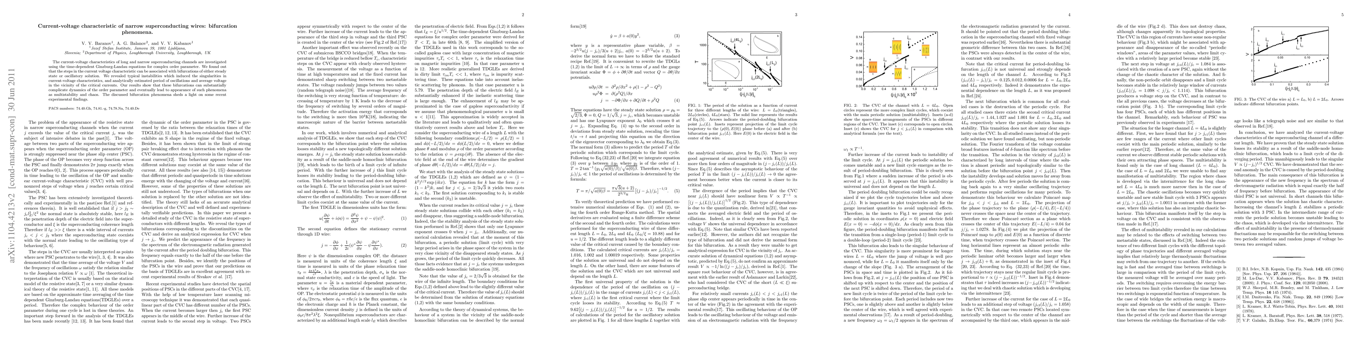 This paper investigates the current-voltage characteristics of narrow superconducting wires using the time-dependent Ginzburg-Landau equations, revealing bifurcation phenomena associated with step-like features in the current-voltage curve. The study identifies instabilities leading to singularities and analytically estimates oscillation periods and voltage near critical currents, highlighting the potential for multistability and chaos in superconducting dynamics.