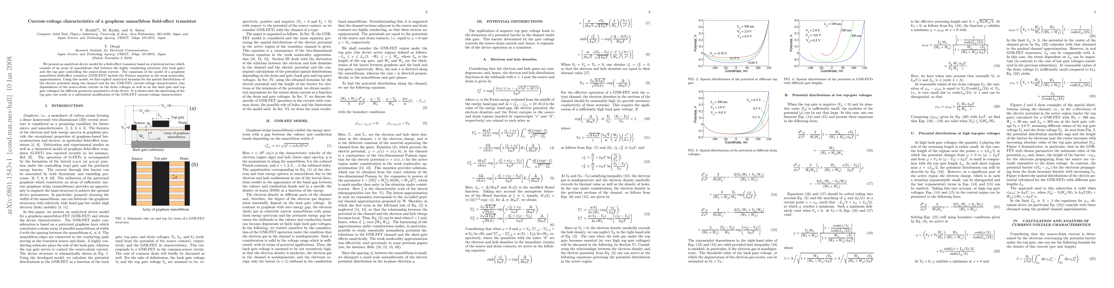 We present an analytical device model for a field-effect transistor based on a heterostructure which consists of an array of nanoribbons clad between the highly conducting substrate (the back gate) and the top gate controlling the source-drain current. The equations of the model of a graphene nanoribbon field-effect transistor (GNR-FET) include the Poisson equation in the weak nonlocality approximation. Using this model, we find explicit analytical formulas for the spatial distributions of the electric potential along the channel and for the GNR-FET current-voltage characteristics (the dependences of the source-drain current on the drain voltages as well as on the back gate and top gate voltages) for different geometric parameters of the device. It is shown that the shortening of the top gate can result in a substantial modification of the GNR-FET current-voltage characteristics.