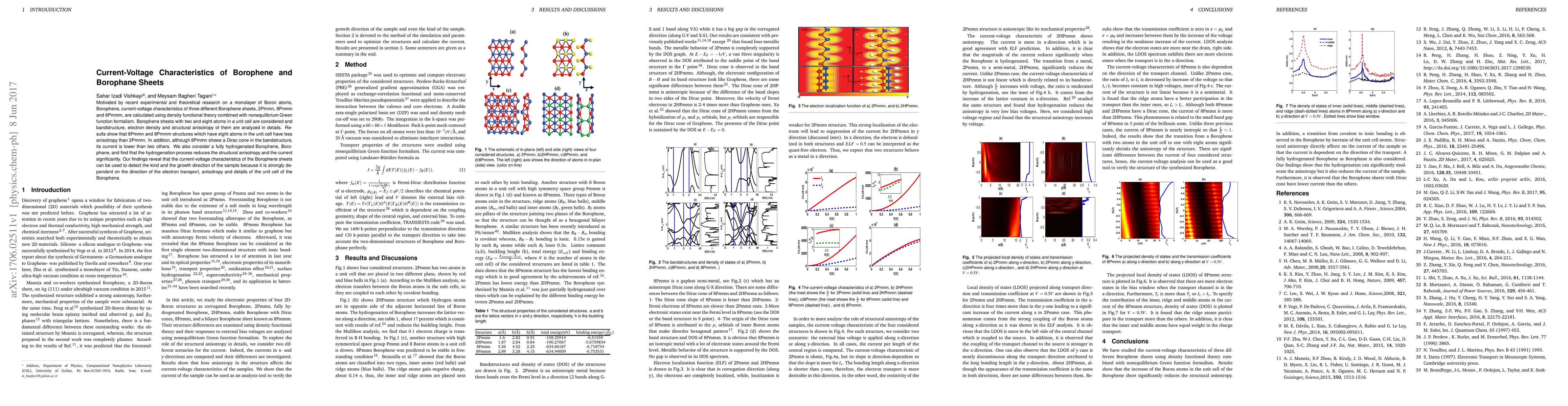 This paper uses density functional theory to analyze the current-voltage characteristics of various Borophene sheets, finding that structures with more atoms per unit cell exhibit less anisotropy and lower current. Borophane, a hydrogenated form of Borophene, shows reduced anisotropy and current. The study concludes that current-voltage behavior can indicate Borophene's structure and growth direction.