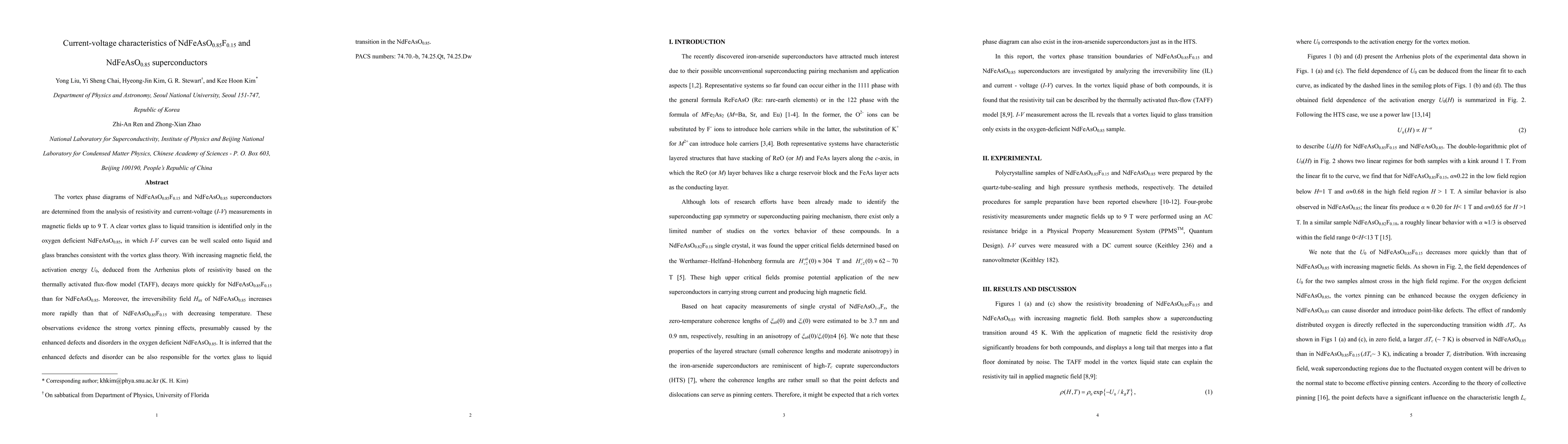 The vortex phase diagrams of NdFeAsO0.85F0.15 and NdFeAsO0.85 superconductors are determined from the analysis of resistivity and current-voltage (I-V) measurements in magnetic fields up to 9 T. A clear vortex glass to liquid transition is identified only in the oxygen deficient NdFeAsO0.85, in which I-V curves can be well scaled onto liquid and glass branches consistent with the vortex glass theory. With increasing magnetic field, the activation energy U0, deduced from the Arrhenius plots of resistivity based on the thermally activated flux-flow model (TAFF), decays more quickly for NdFeAsO0.85F0.15 than for NdFeAsO0.85. Moreover, the irreversibility field Hirr of NdFeAsO0.85 increases more rapidly than that of NdFeAsO0.85F0.15 with decreasing temperature. These observations evidence the strong vortex pinning effects, presumably caused by the enhanced defects and disorders in the oxygen deficient NdFeAsO0.85. It is inferred that the enhanced defects and disorder can be also responsible for the vortex glass to liquid transition in the NdFeAsO0.85.