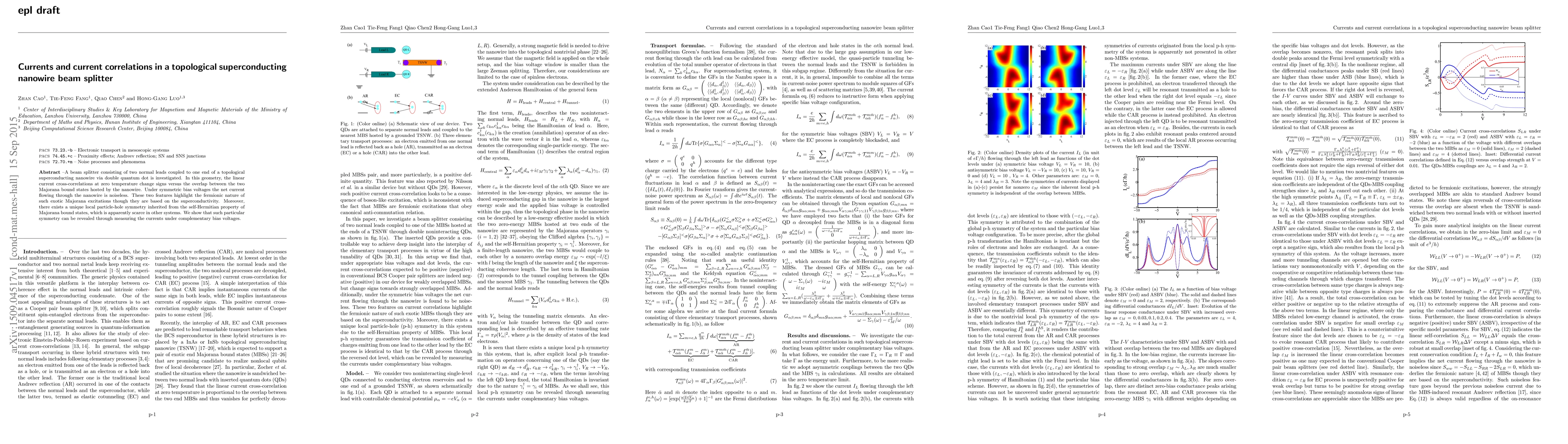 This paper investigates a beam splitter with a topological superconducting nanowire connected via double quantum dots, revealing that current cross-correlations change signs with Majorana bound state overlap, and net current is noiseless under symmetric bias. The unique local particle-hole symmetry from Majorana states is demonstrated through current measurements under different biases.