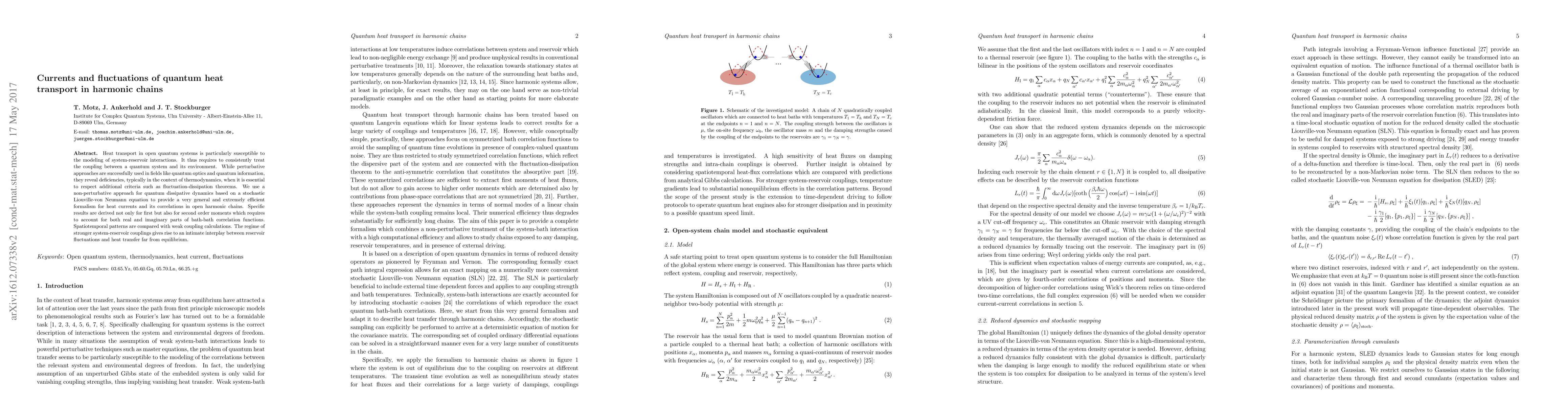 The paper presents a flexible and efficient computational scheme based on a stochastic Liouville-von Neumann equation, enabling the study of heat currents and their spatiotemporal correlations in damped harmonic chains, including stronger couplings to thermal reservoirs.