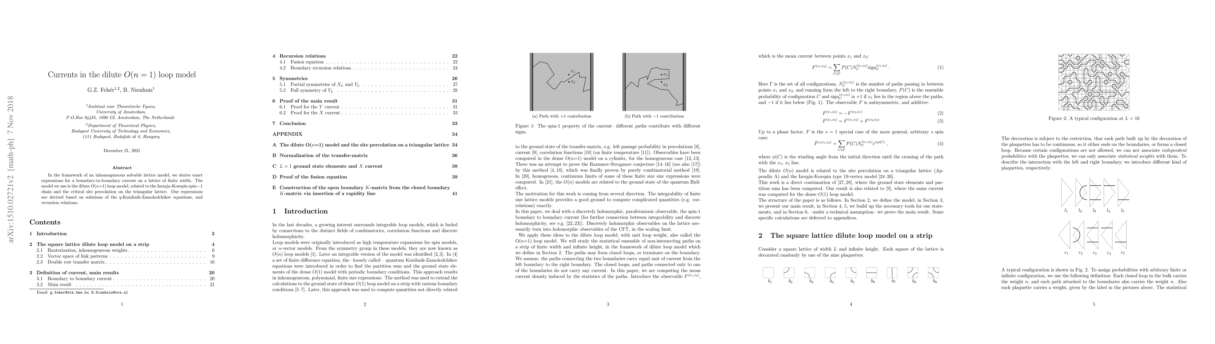This paper derives exact expressions for a boundary-to-boundary current in the dilute $O(n=1)$ loop model using solutions to the $q$-Knizhnik-Zamolodchikov equations and recursion relations, linking it to the Izergin-Korepin spin-1 chain and critical site percolation on the triangular lattice.