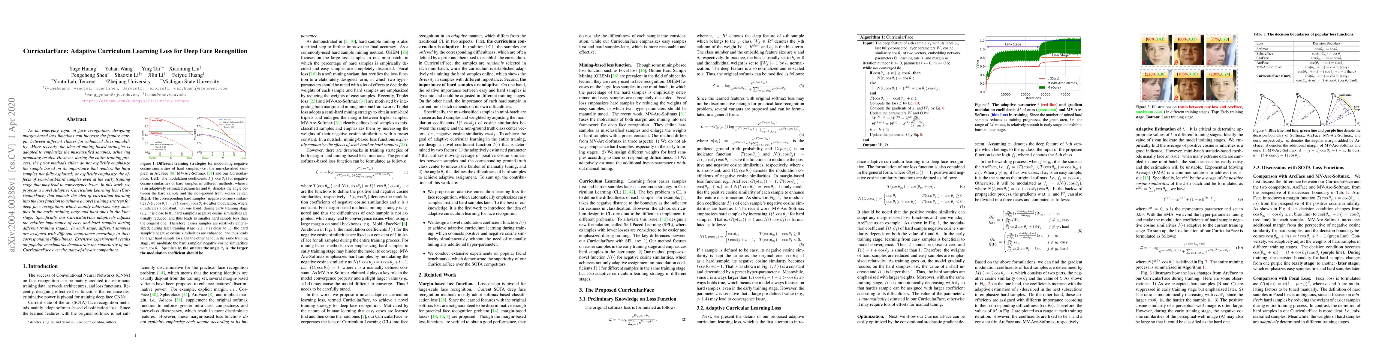 A new loss function called CurricularFace is proposed to adaptively prioritize easy and hard samples during training for deep face recognition, achieving superior results on benchmarks.