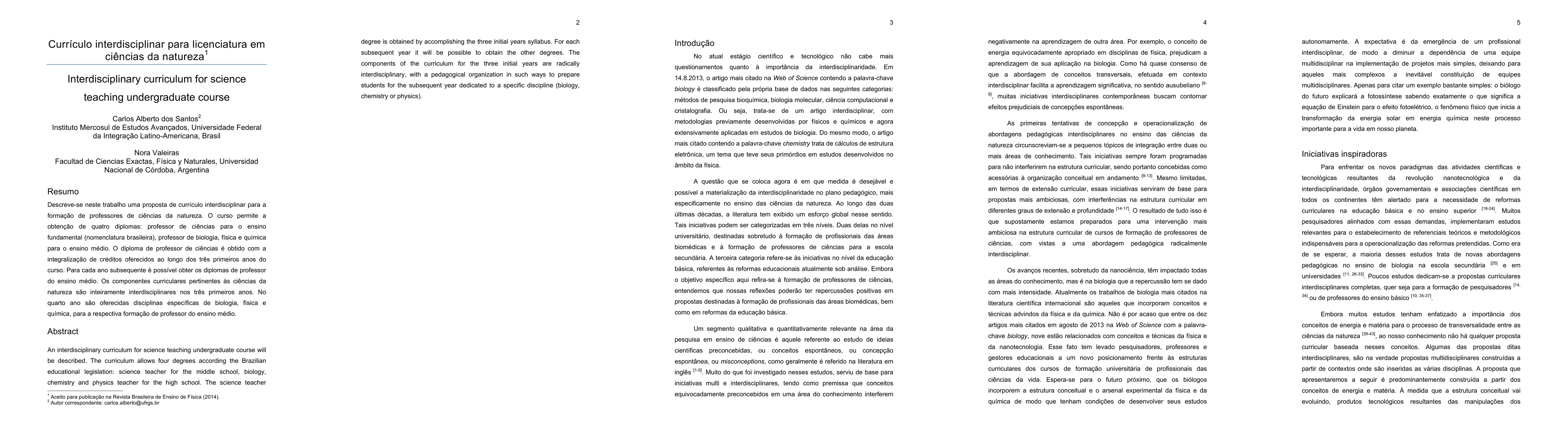 This paper proposes an interdisciplinary curriculum for training science teachers in Brazil, offering four degrees: science teacher for elementary school and biology, physics, and chemistry teachers for high school. The first three years are entirely interdisciplinary, preparing students for specialized subjects in the fourth year.
