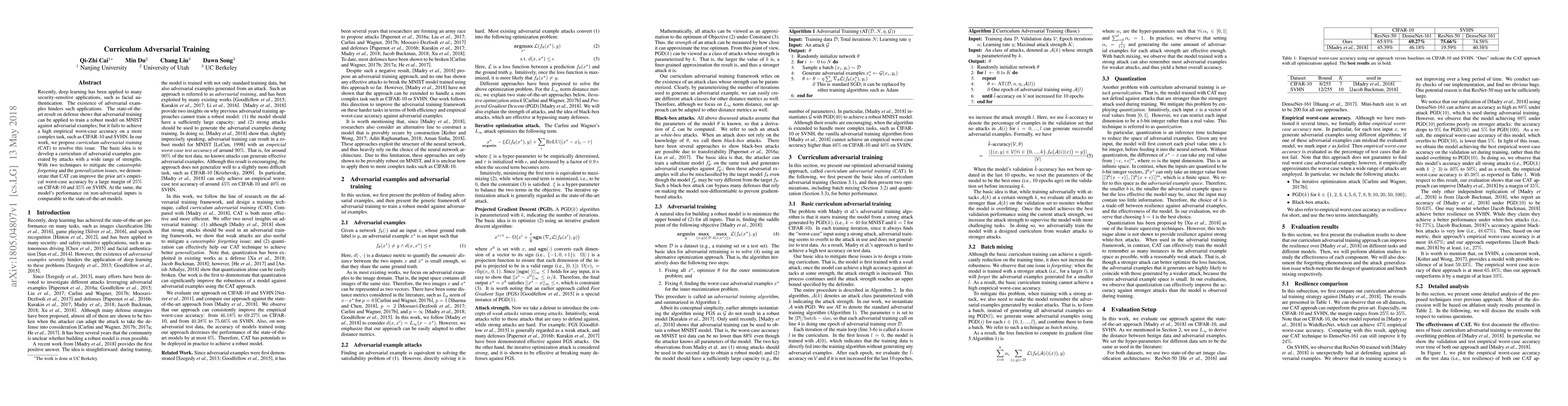 Recently, deep learning has been applied to many security-sensitive applications, such as facial authentication. The existence of adversarial examples hinders such applications. The state-of-the-art result on defense shows that adversarial training can be applied to train a robust model on MNIST against adversarial examples; but it fails to achieve a high empirical worst-case accuracy on a more complex task, such as CIFAR-10 and SVHN. In our work, we propose curriculum adversarial training (CAT) to resolve this issue. The basic idea is to develop a curriculum of adversarial examples generated by attacks with a wide range of strengths. With two techniques to mitigate the forgetting and the generalization issues, we demonstrate that CAT can improve the prior art's empirical worst-case accuracy by a large margin of 25% on CIFAR-10 and 35% on SVHN. At the same, the model's performance on non-adversarial inputs is comparable to the state-of-the-art models.