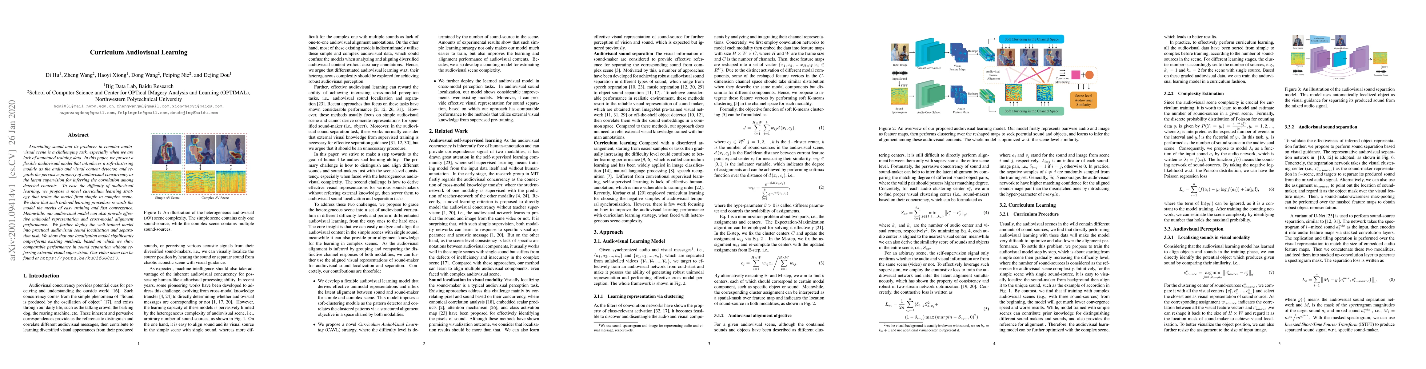 Associating sound and its producer in complex audiovisual scene is a challenging task, especially when we are lack of annotated training data. In this paper, we present a flexible audiovisual model that introduces a soft-clustering module as the audio and visual content detector, and regards the pervasive property of audiovisual concurrency as the latent supervision for inferring the correlation among detected contents. To ease the difficulty of audiovisual learning, we propose a novel curriculum learning strategy that trains the model from simple to complex scene. We show that such ordered learning procedure rewards the model the merits of easy training and fast convergence. Meanwhile, our audiovisual model can also provide effective unimodal representation and cross-modal alignment performance. We further deploy the well-trained model into practical audiovisual sound localization and separation task. We show that our localization model significantly outperforms existing methods, based on which we show comparable performance in sound separation without referring external visual supervision. Our video demo can be found at https://youtu.be/kuClfGG0cFU.