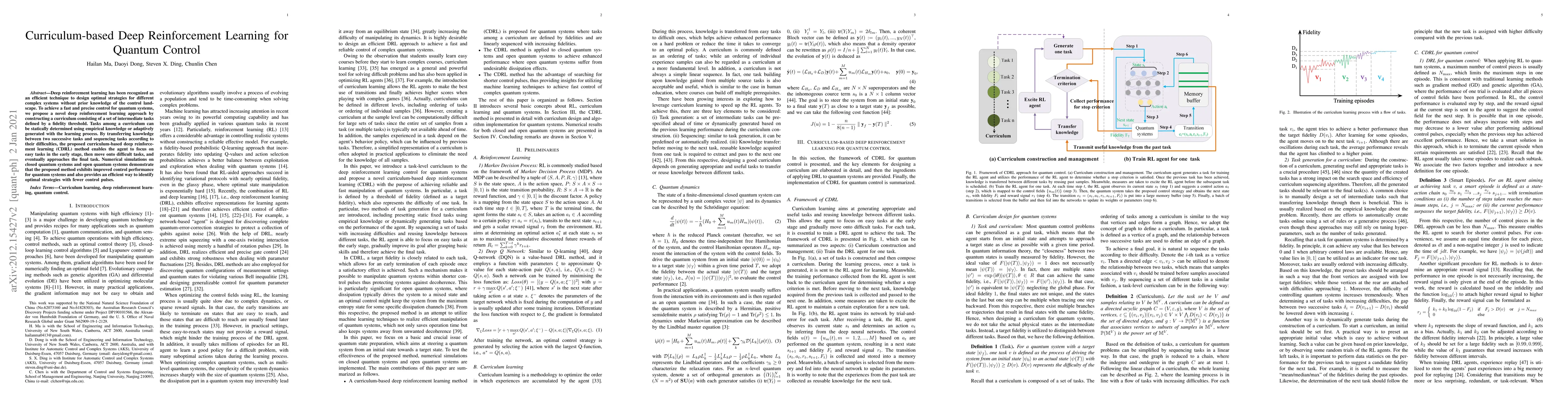 This paper proposes a curriculum-based deep reinforcement learning approach for quantum control, utilizing a sequence of intermediate tasks to improve control performance. The method demonstrates enhanced control efficiency and optimal strategy identification with fewer control pulses through simulations on both closed and open quantum systems.
