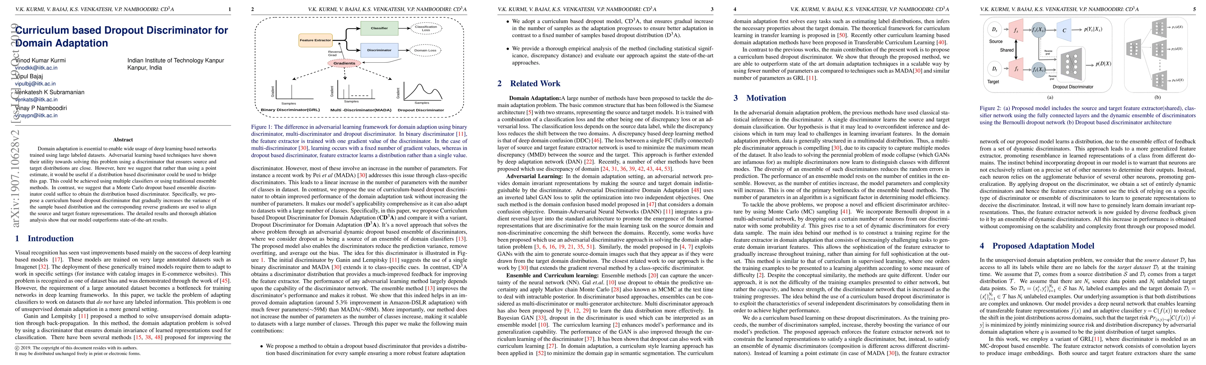 This paper proposes a curriculum-based dropout discriminator for domain adaptation using a Monte Carlo dropout ensemble to create a distribution-based discriminator. The method gradually increases variance to align source and target distributions, outperforming state-of-the-art techniques as shown by detailed results and ablation analysis.