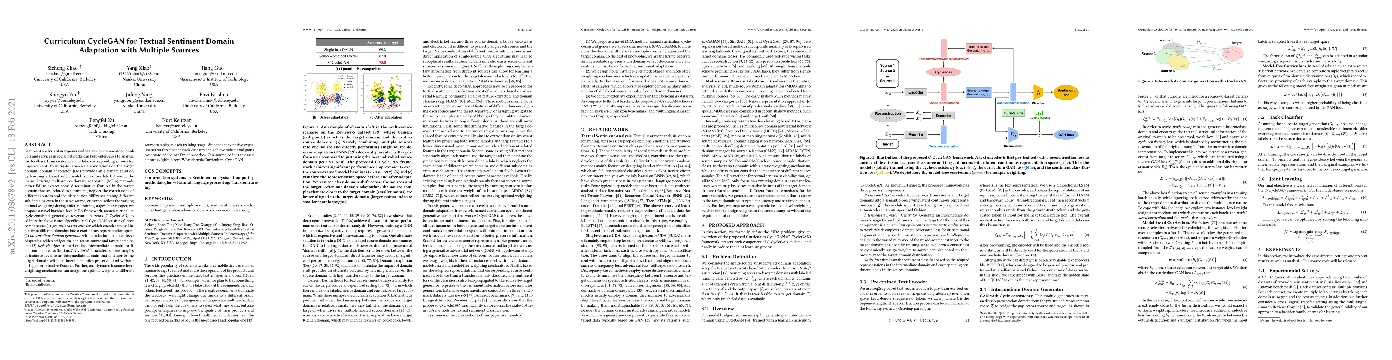 This paper proposes a novel domain adaptation framework called Curriculum CycleGAN to improve sentiment analysis performance on target domains with limited labeled data. It achieves substantial gains over state-of-the-art approaches through instance-level adaptation and dynamic weighting mechanisms.