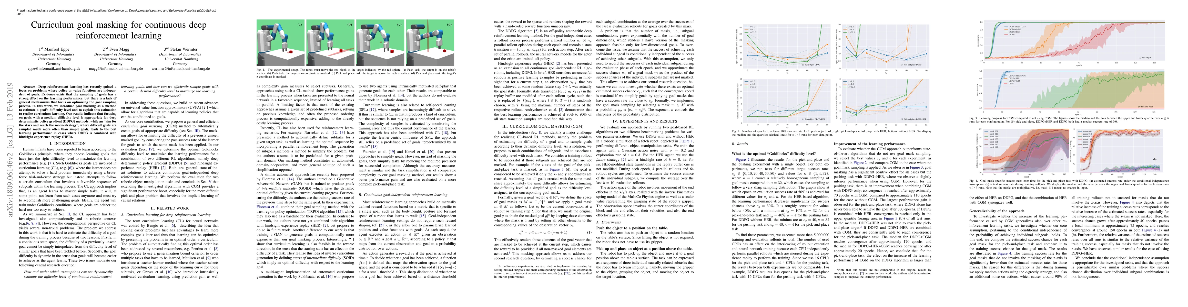 This paper introduces a goal masking method to optimize goal sampling in continuous deep reinforcement learning, particularly for DDPG and DDPG with HER. The method estimates goal difficulty and employs a curriculum approach, showing improved performance over standard goal sampling in robotic manipulation tasks.