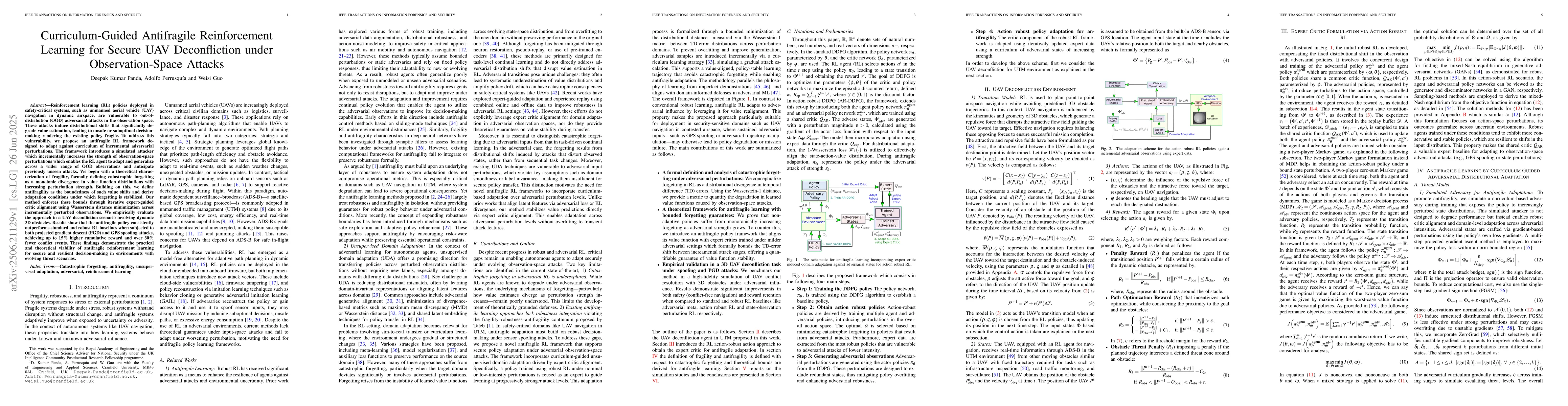 The research develops an antifragile reinforcement learning framework that incorporates a curriculum of incremental adversarial observation-space perturbations, guided by expert critics and Wasserstein distance minimization, to enhance UAV deconfliction safety under attack scenarios.