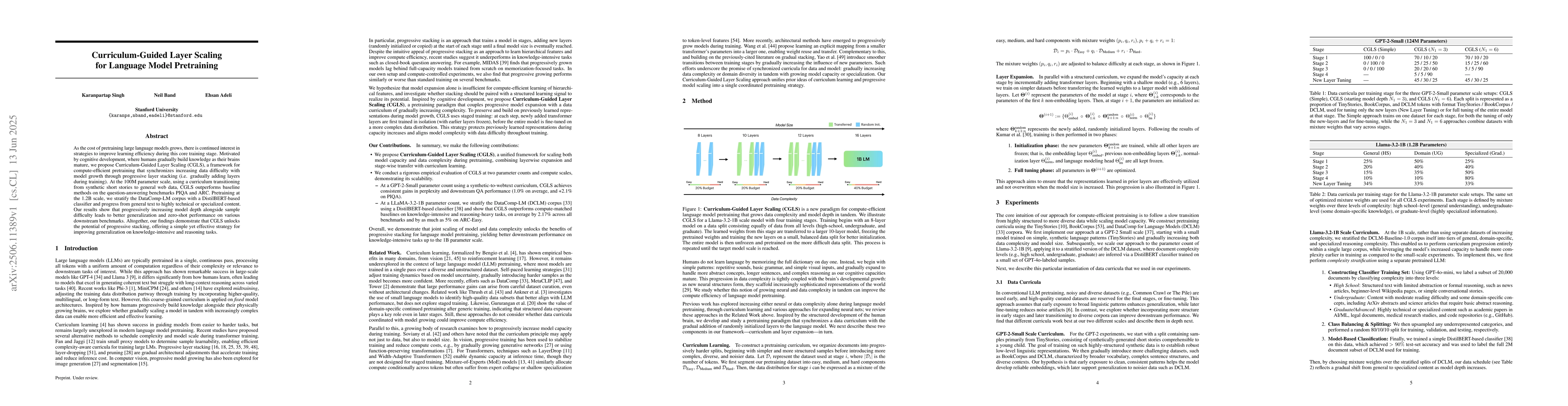 As the cost of pretraining large language models grows, there is continued interest in strategies to improve learning efficiency during this core training stage. Motivated by cognitive development, where humans gradually build knowledge as their brains mature, we propose Curriculum-Guided Layer Scaling (CGLS), a framework for compute-efficient pretraining that synchronizes increasing data difficulty with model growth through progressive layer stacking (i.e. gradually adding layers during training). At the 100M parameter scale, using a curriculum transitioning from synthetic short stories to general web data, CGLS outperforms baseline methods on the question-answering benchmarks PIQA and ARC. Pretraining at the 1.2B scale, we stratify the DataComp-LM corpus with a DistilBERT-based classifier and progress from general text to highly technical or specialized content. Our results show that progressively increasing model depth alongside sample difficulty leads to better generalization and zero-shot performance on various downstream benchmarks. Altogether, our findings demonstrate that CGLS unlocks the potential of progressive stacking, offering a simple yet effective strategy for improving generalization on knowledge-intensive and reasoning tasks.