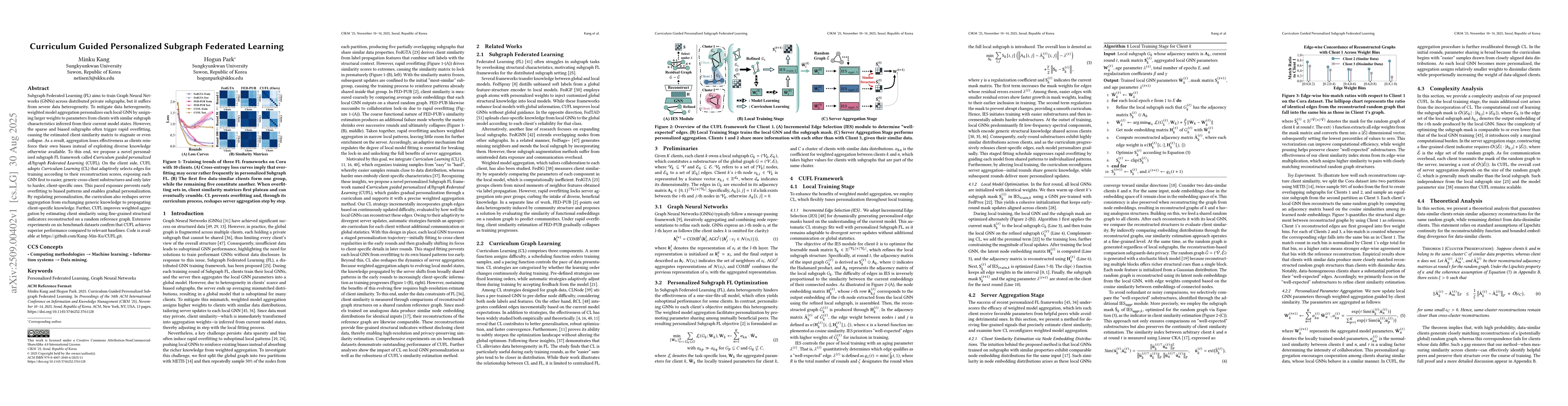 Subgraph Federated Learning (FL) aims to train Graph Neural Networks (GNNs) across distributed private subgraphs, but it suffers from severe data heterogeneity. To mitigate data heterogeneity, weighted model aggregation personalizes each local GNN by assigning larger weights to parameters from clients with similar subgraph characteristics inferred from their current model states. However, the sparse and biased subgraphs often trigger rapid overfitting, causing the estimated client similarity matrix to stagnate or even collapse. As a result, aggregation loses effectiveness as clients reinforce their own biases instead of exploiting diverse knowledge otherwise available. To this end, we propose a novel personalized subgraph FL framework called Curriculum guided personalized sUbgraph Federated Learning (CUFL). On the client side, CUFL adopts Curriculum Learning (CL) that adaptively selects edges for training according to their reconstruction scores, exposing each GNN first to easier, generic cross-client substructures and only later to harder, client-specific ones. This paced exposure prevents early overfitting to biased patterns and enables gradual personalization. By regulating personalization, the curriculum also reshapes server aggregation from exchanging generic knowledge to propagating client-specific knowledge. Further, CUFL improves weighted aggregation by estimating client similarity using fine-grained structural indicators reconstructed on a random reference graph. Extensive experiments on six benchmark datasets confirm that CUFL achieves superior performance compared to relevant baselines. Code is available at https://github.com/Kang-Min-Ku/CUFL.git.