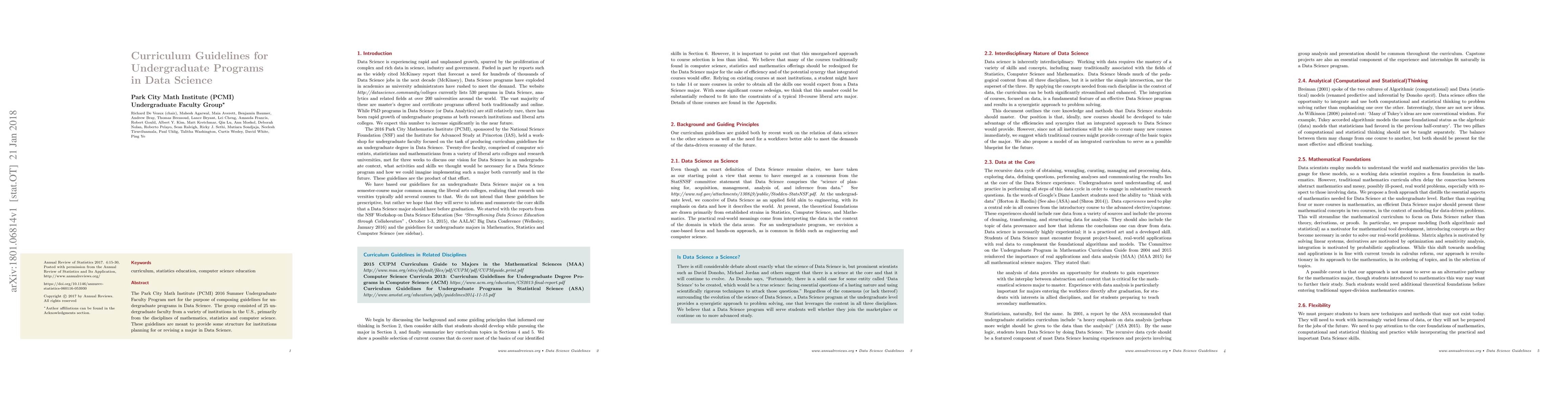 The Park City Math Institute's 2016 Summer Undergraduate Faculty Program created guidelines for undergraduate Data Science programs, aiming to provide structure for institutions developing or revising such majors. The guidelines were developed by a diverse group of 25 faculty members from various U.S. institutions, primarily in mathematics, statistics, and computer science.