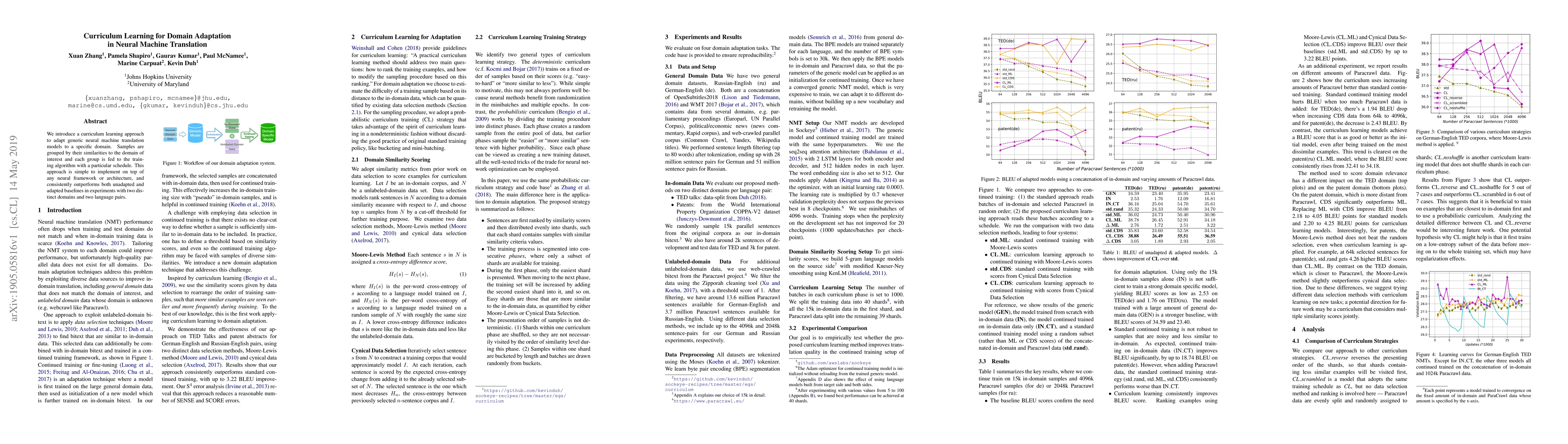 This paper proposes a curriculum learning method to adapt generic neural machine translation models to specific domains, showing improved performance over unadapted and baseline models through experiments with two domains and two language pairs. The approach is easy to implement and consistently outperforms existing methods.