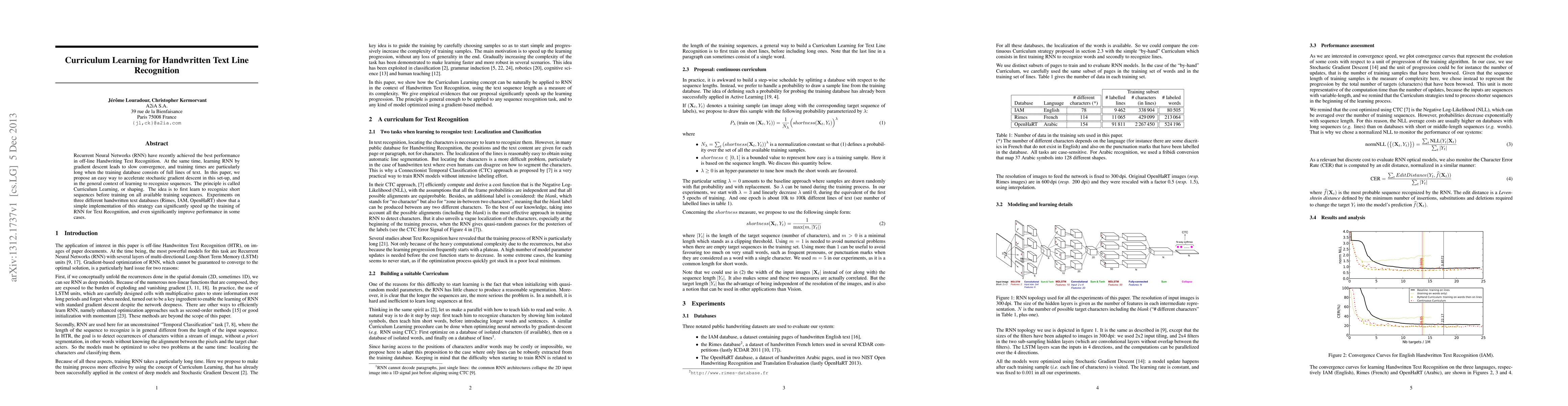This paper proposes using Curriculum Learning to accelerate the training of Recurrent Neural Networks (RNN) for offline Handwriting Text Recognition. By initially training on shorter sequences before progressing to full lines, the method significantly speeds up convergence and improves performance on several handwritten text databases.
